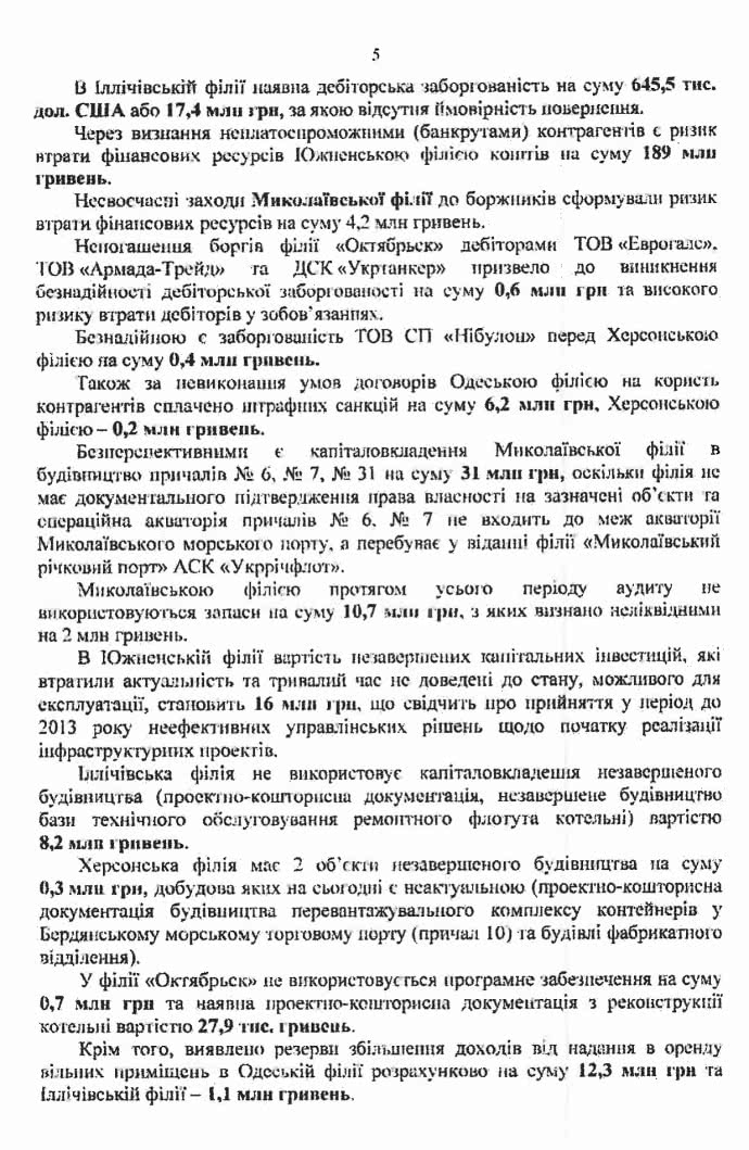 Также установлено, что бесперспективными являются капиталовложения Николаевского филиала в строительство причалов №№6, 7, 31 на сумму 31 миллион гривен, поскольку филиал не имеет документального подтверждения права собственности на указанные объекты, а операционная акватория причалов №№ 6 и 7 не входит в границы акватории Николаевского морского порта, а находится в ведении филиала «Николаевский речной флот» АСК «Укрречфлот».