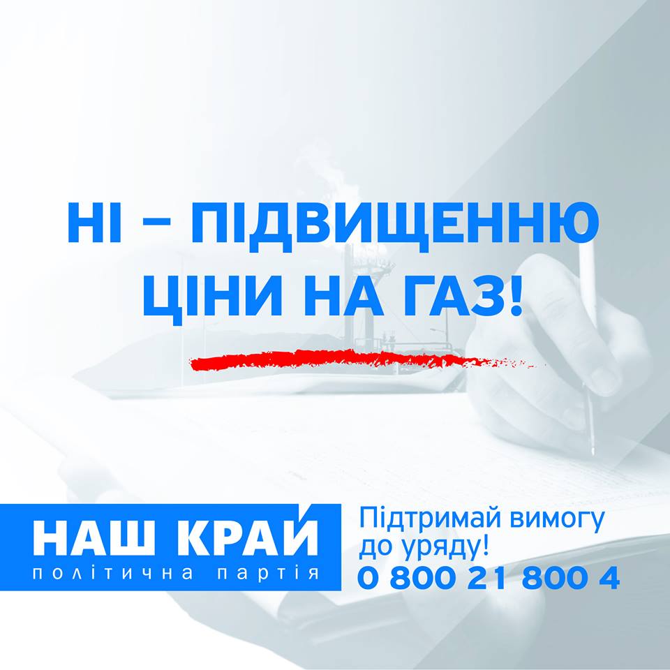 Партия «Наш край» призывает правительство: наращивать добычу украинского газа, направить весь газ украинской добычи на потребности людей и ЖКХ, ликвидировать коррупцию в отрасли - принятие решений должно быть прозрачным, устранить газовые «прокладки» - компании олигархов, которые обогащаются на украинцах, не идти на кабальные, антисоциальные и антиукраинские условия МВФ ради очередного кредита, отстаивать интересы украинских граждан.