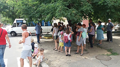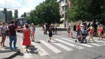 Группа протестующих в основном состоит из женщин и детей. Митингующие в самый разгар жары перекрыли улицу Курортную (Бутомы) – около 10 человек вместе с маленькими детьми ходят по пешеходному переходу. Возле этого перехода застряли уже семь троллейбусов, которые не могут проехать.