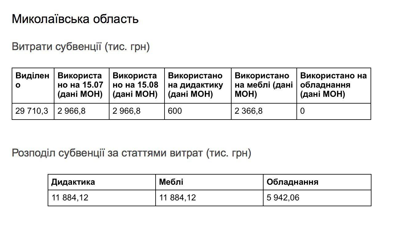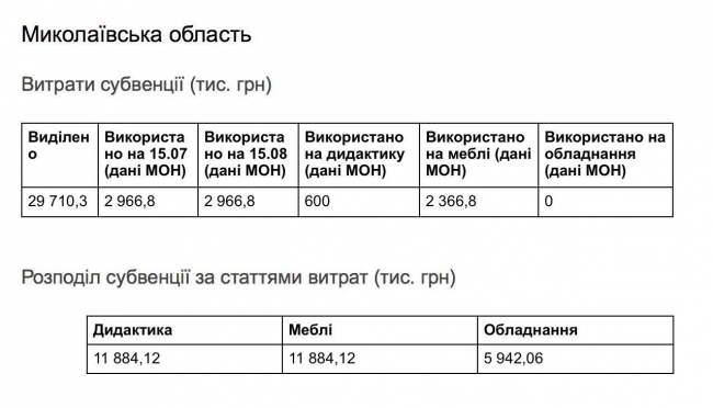 Распределение средств в Николаевской области по статьям расходов определили следующим образом: дидактика – 11 тысяч 884 гривны 12 копеек, мебель - 11 тысяч 884 гривны 12 копеек, оборудование – 5 тысяч 942 гривны 06 копеек.