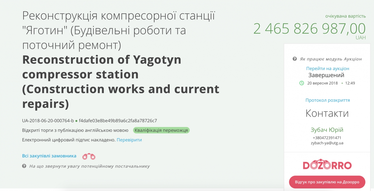 20 сентябя состоялось раскрытие тендера на реконструкцию станции «Яготин», принадлежащей «Укртрансгазу». Ожидаемая стоимость работ - примерно 2,5 млрд гривен.