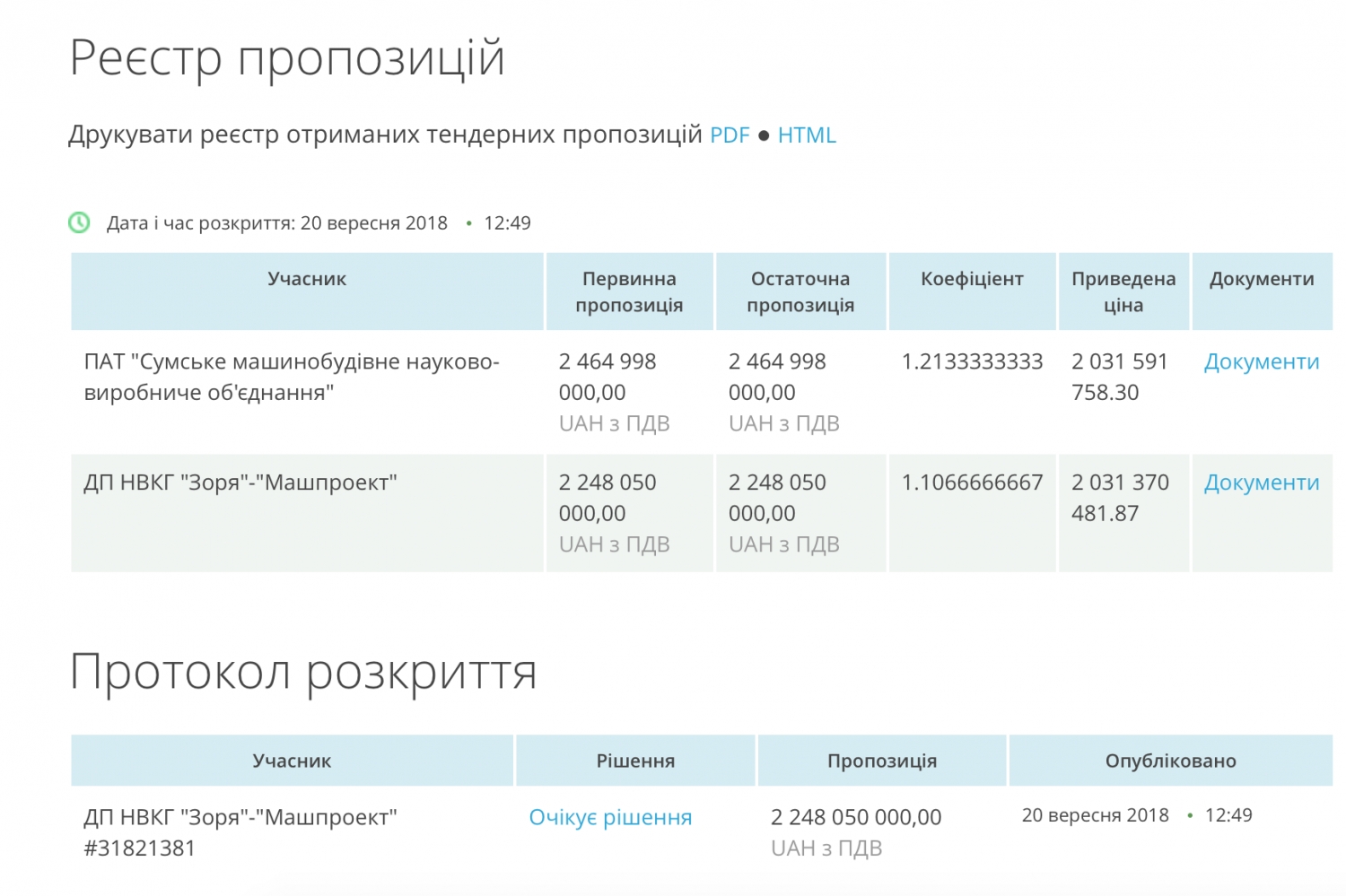 Раскрытие показало, что лучшее ценовое предложение оказалось у государственного предприятия «Заря»-«Машпроект» — 2 миллиарда 248 миллионов 50 тысяч гривен. Тендерный комитет уже акцептировал их предложение.