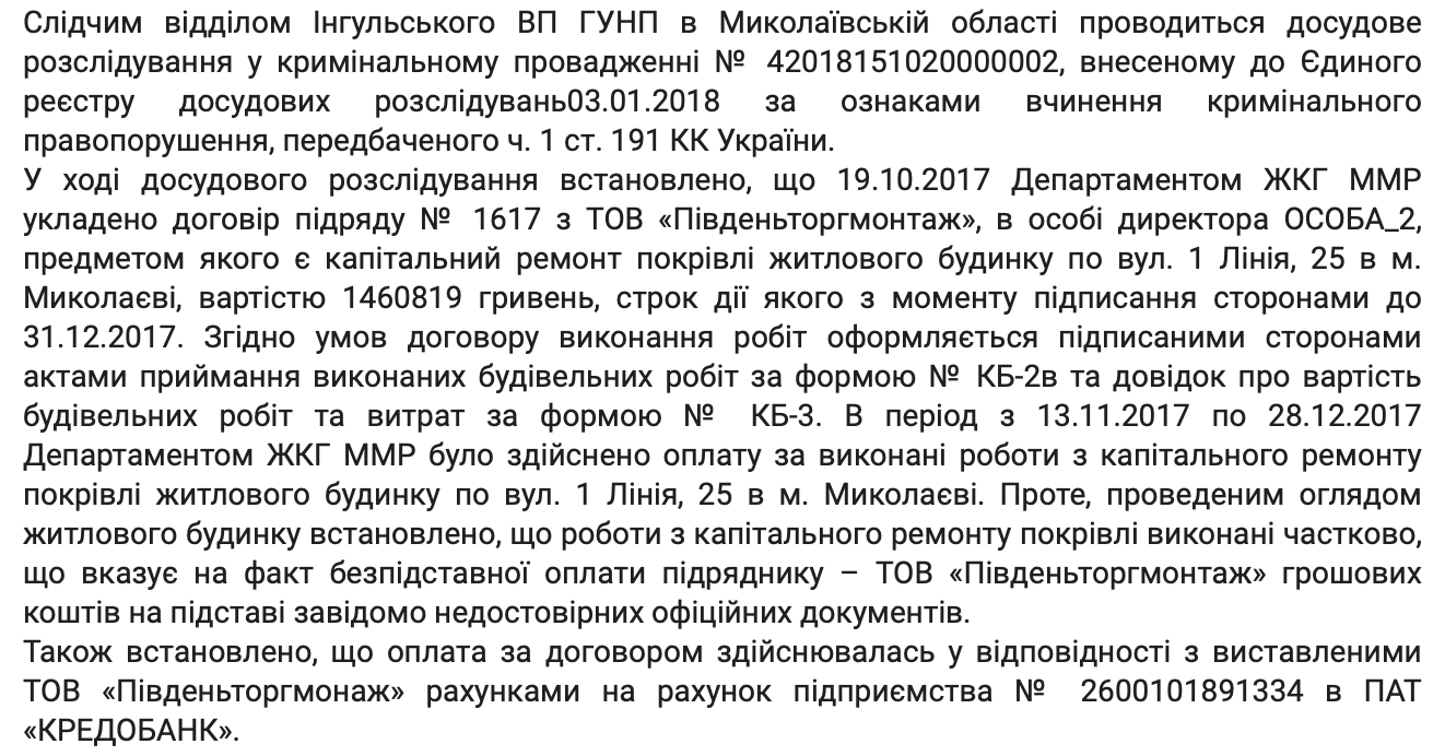 В ходе досудебного расследования установлено, что 19.10.2017 Департаментом ЖКХ заключен договор подряда с ООО «Південьторгмонтаж», предметом которого является капитальный ремонт кровли жилого дома по улице 1 Линия, 25 в Николаеве стоимостью 1 460 819 гривен, срок действия которого с момента подписания сторонами до 31.12.2017.