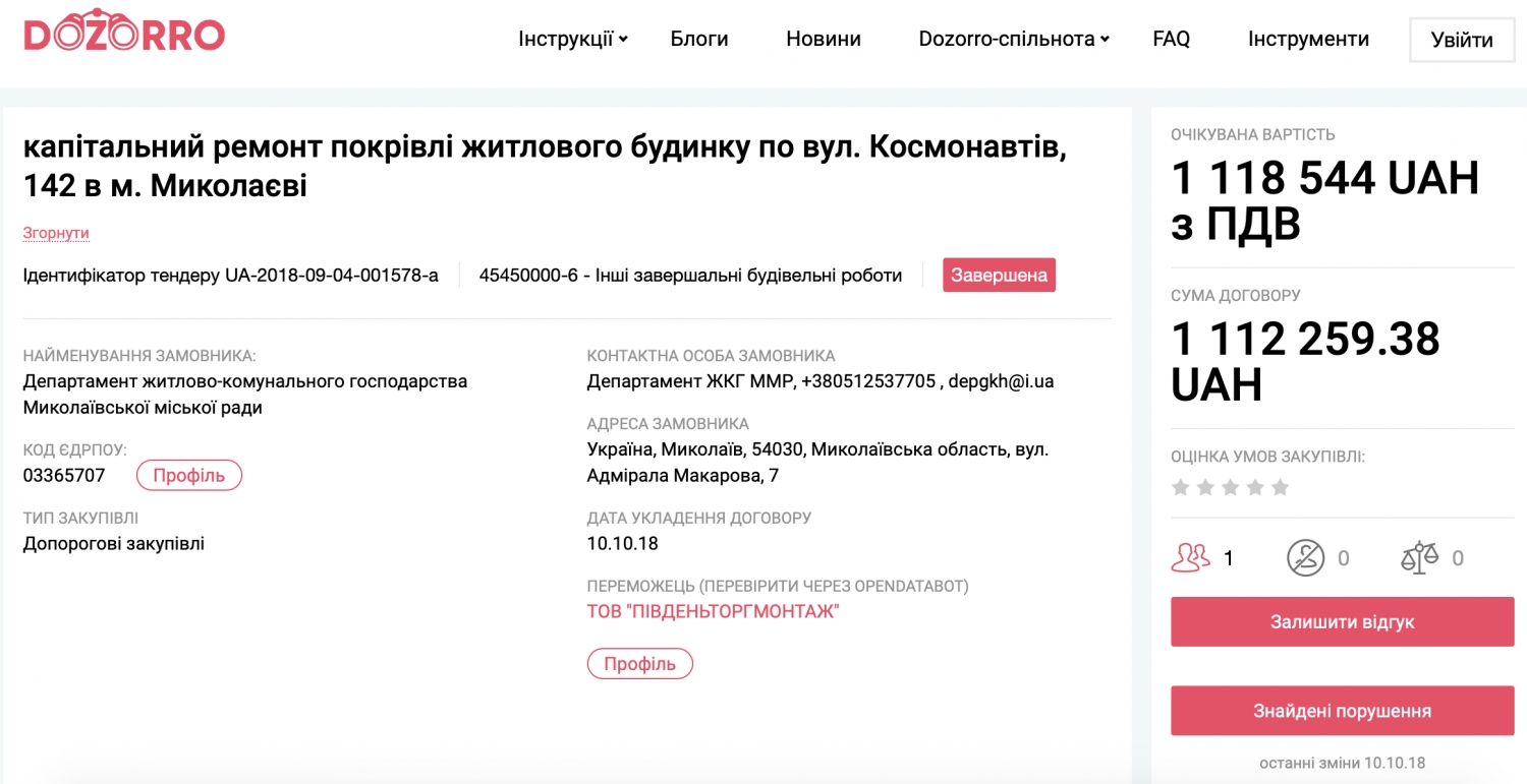 Департамент ЖКХ Николаевского городского совета отдаст 1 миллион 118 тысяч 544 гривны на капитальный ремонт кровли жилого дома по улице Космонавтов, 142 в Николаеве предприятию ООО «Південьторгмонтаж», которое фигурирует в досудебном расследовании о растрате средств Департамента, выделенных на капитальный ремонт кровли другого жилого дома в Николаеве.