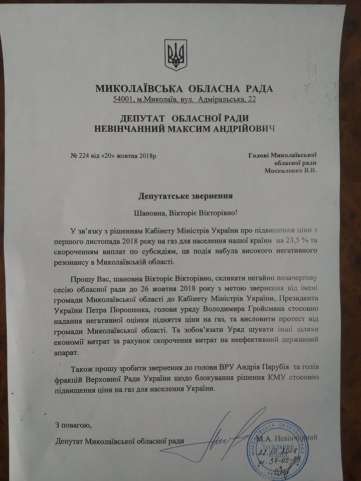 Депутат Николаевского областного совета представитель партии «За життя» Максим Невенчанный требует созвать внеочередную сессию облсовета, на которой депутатам поддержать обращение к Кабинету министров Украины с требованием не допустить повышение цены на газ.