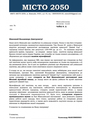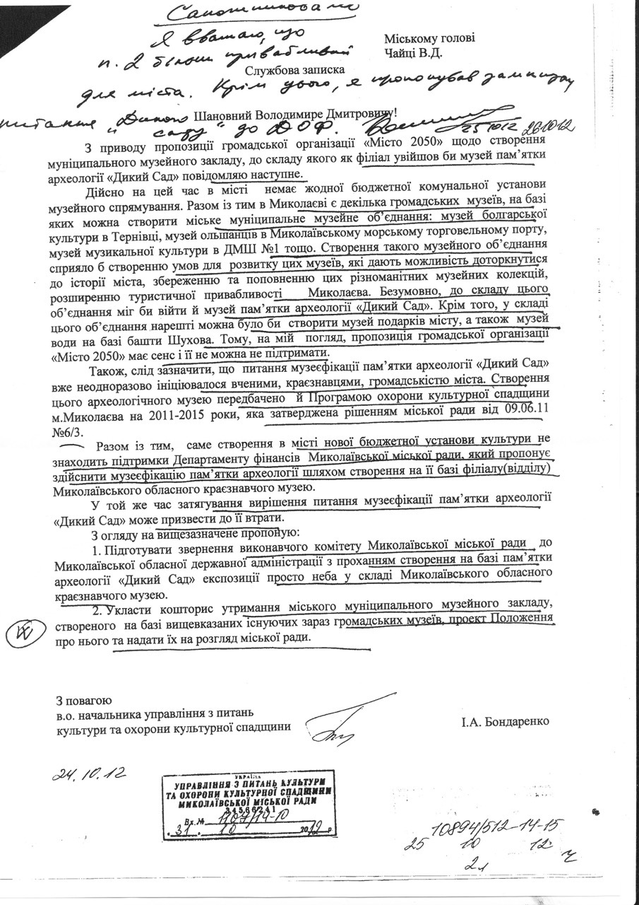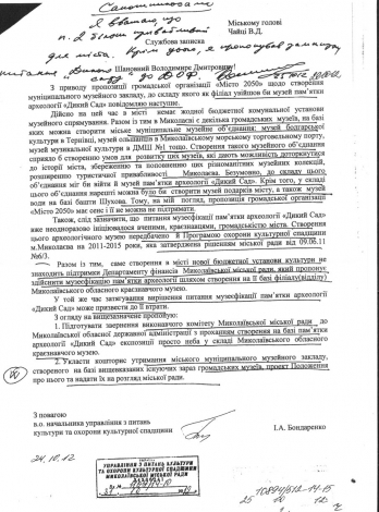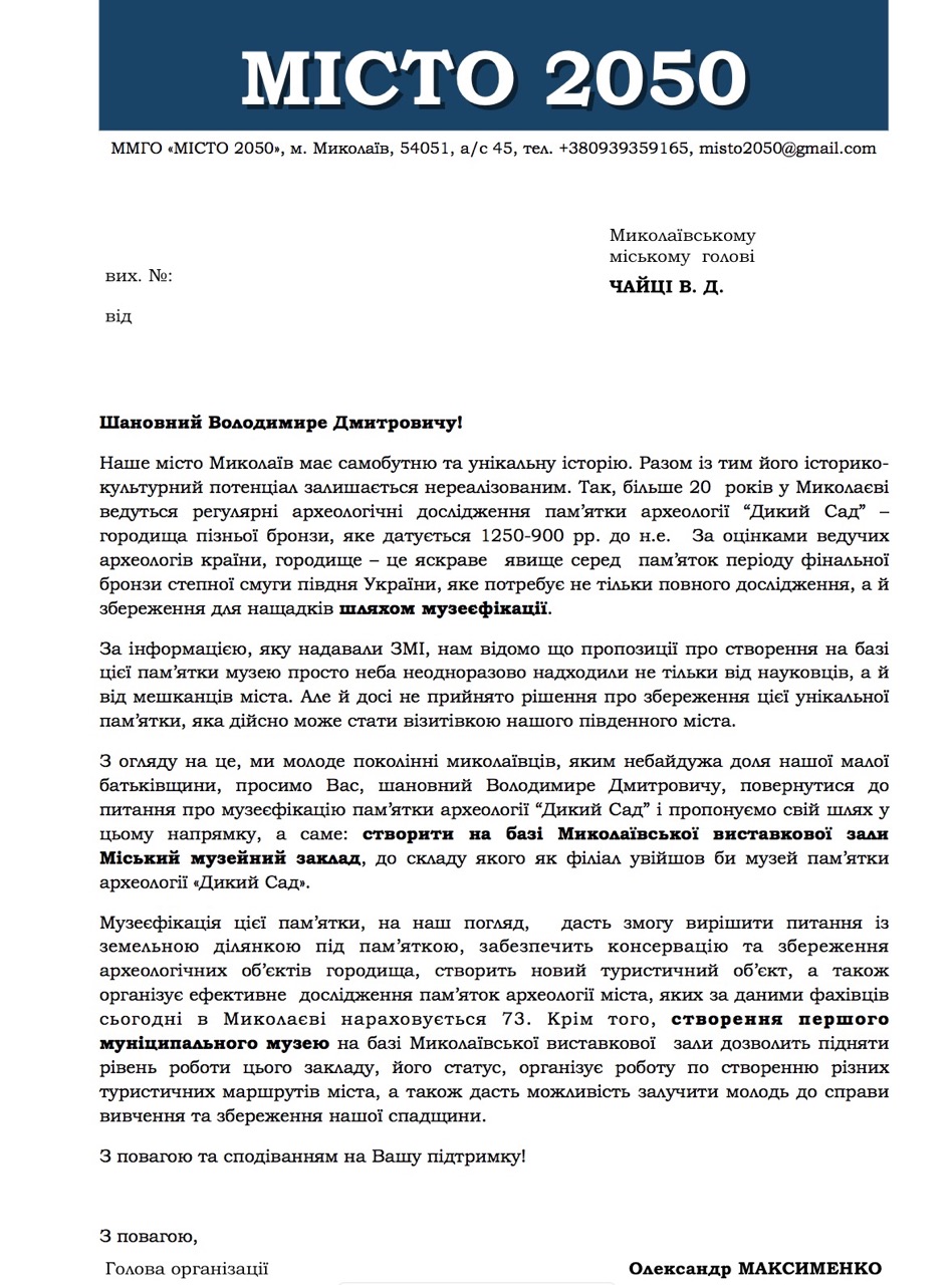 В 2012 году общественная организация «МІСТО 2050» обратилась к мэру Николаева Владимиру Чайке с предложением создать на базе Муниципального выставочного зала городское музейное учреждение, в состав которого как филиал вошел бы музей памятника археологии «Дикий Сад».