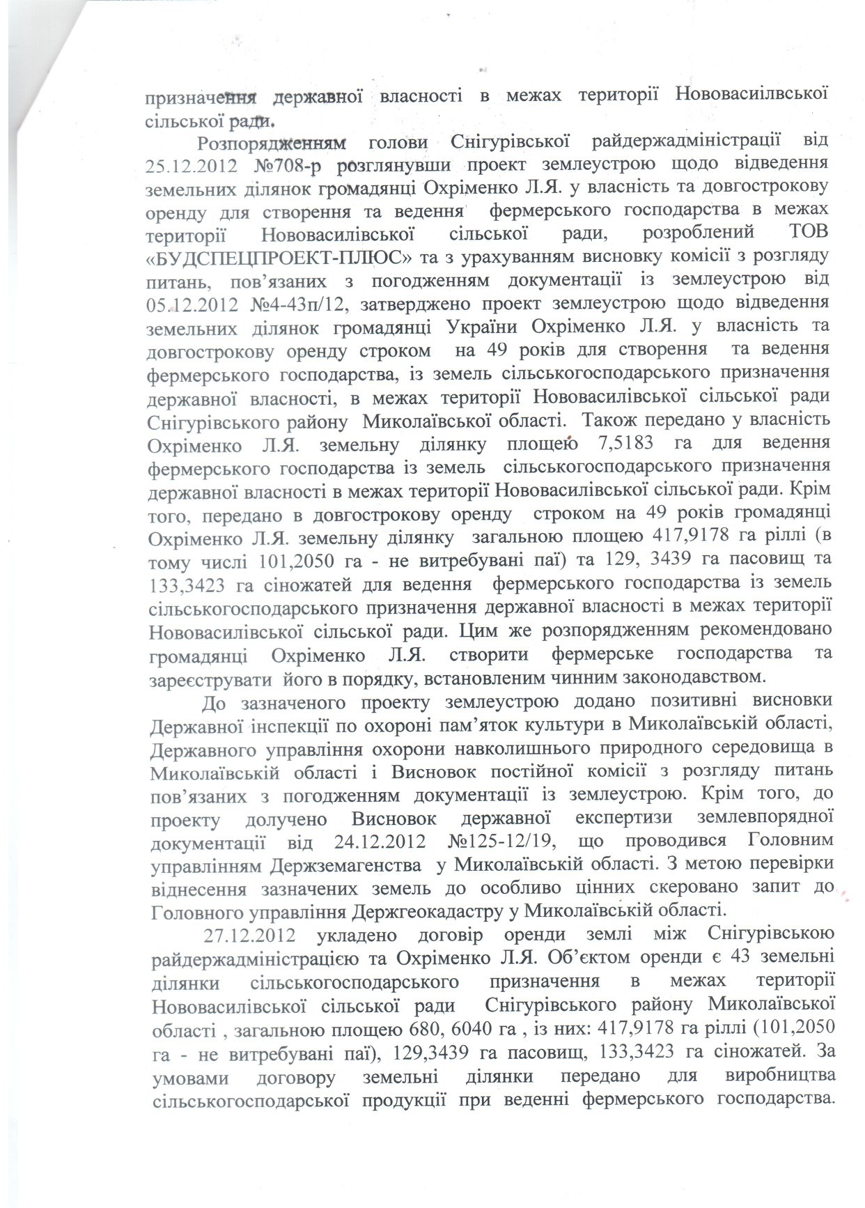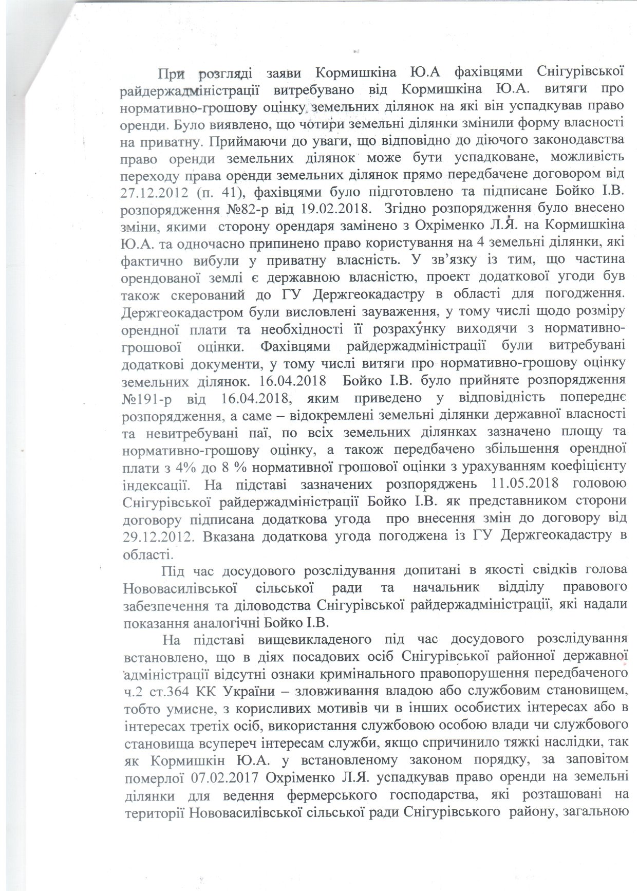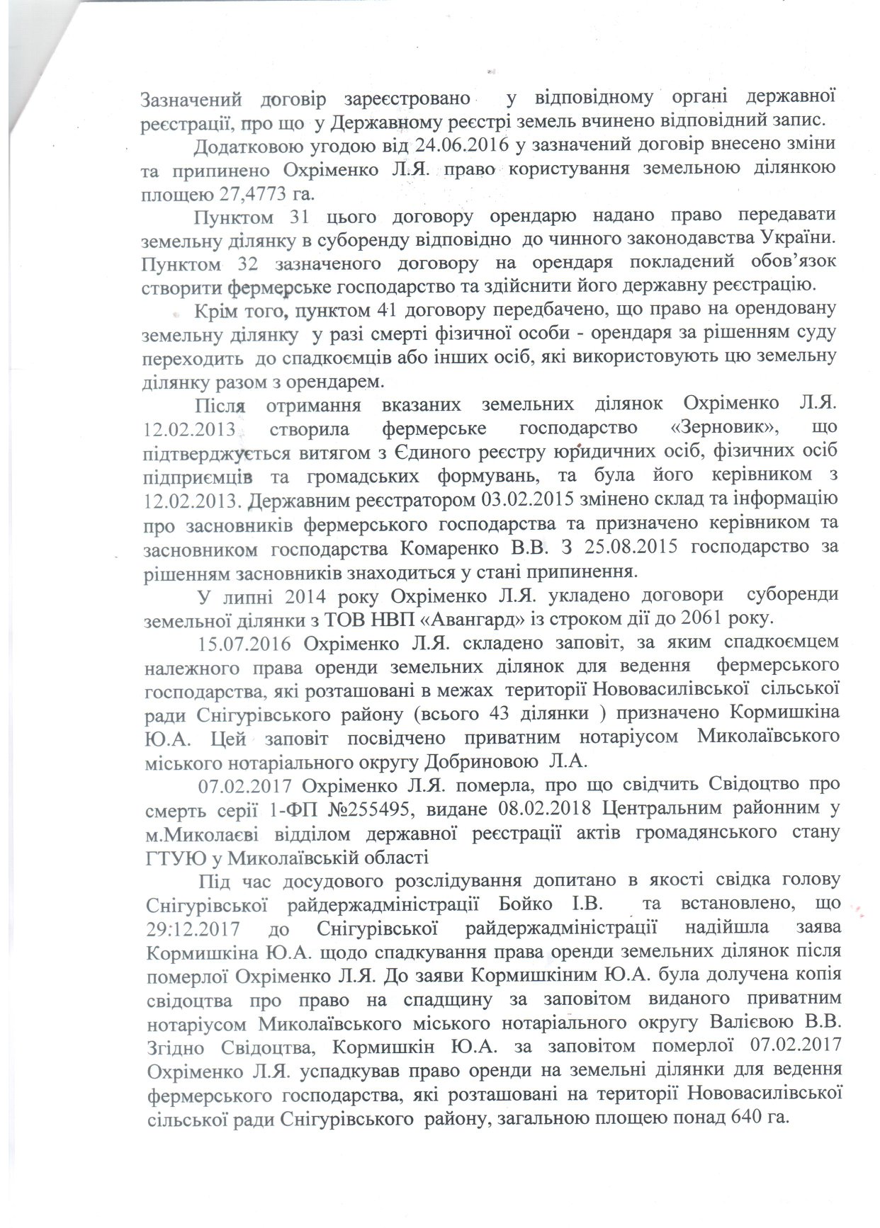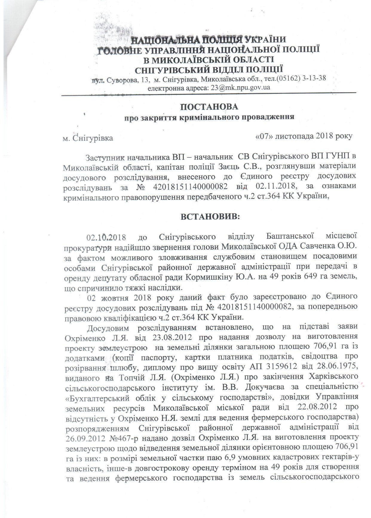 В постановлении о закрытии производства говорится, что 2 октября в Снириевское отделение прокуратуры поступило обращение губернатора Николаевщины Алексея Савченко о возможном злоупотреблении служебным положением чиновниками Снигиревской РГА при передаче в аренду Юрию Кормышкину на 49 лет 649 гектаров земель. Однако в ходе досудебного расследования выяснилось, что Юрий Кормышкин унаследовал право аренды земельных участков для ведения фермерского хозяйства, которые находятся на территории Нововасильевского сельского совета общей площадью 640 гектаров.