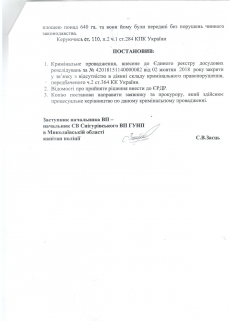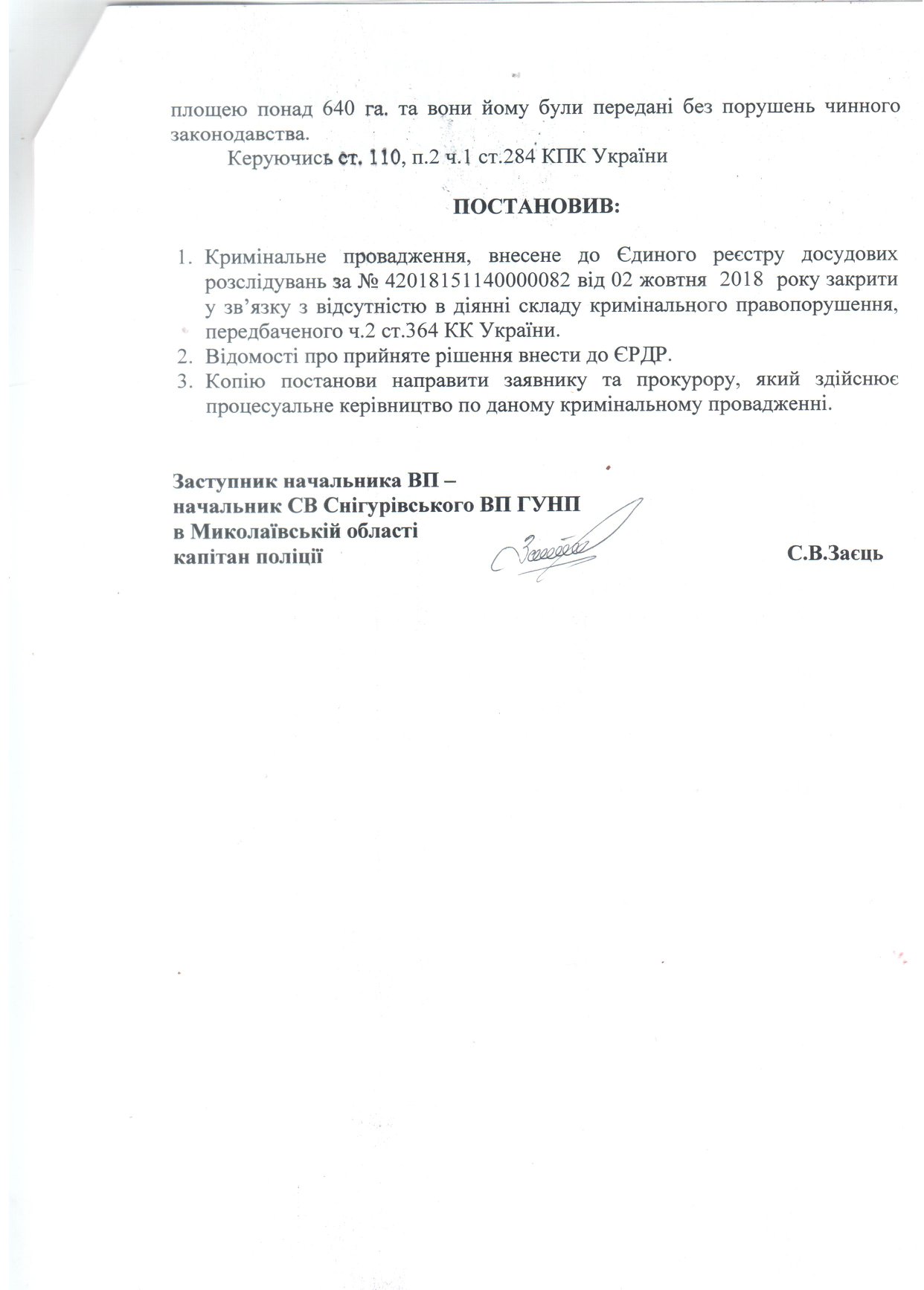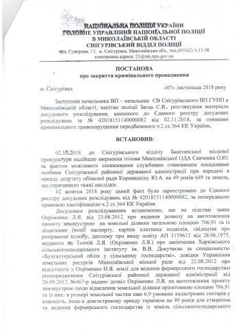 Об этом свидетельствует соответствующее постановление о закрытии уголовного производства от 7 ноября, которое в социальной сети Facebook опубликовала глава Снигиревской РГА Инна Бойко.