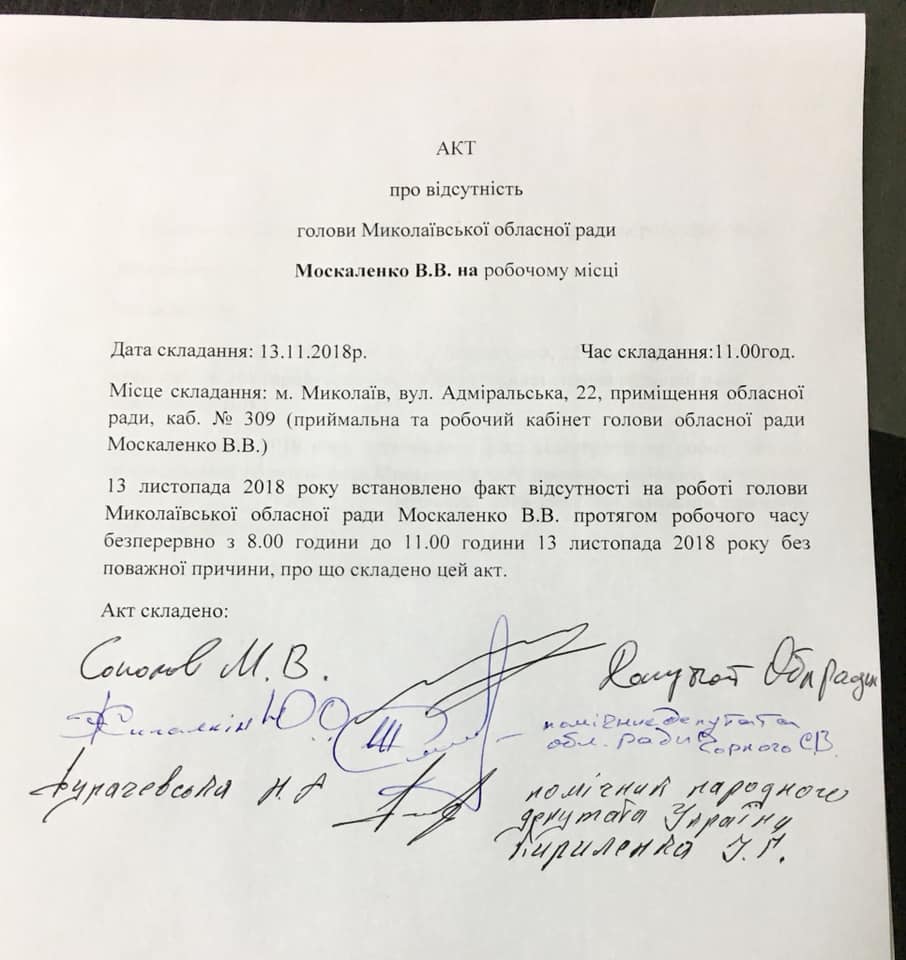 Глава Николаевской областной организации ВО «Батькивщина» Михаил Соколов составил акт об отсутствии на рабочем месте главы Николаевского областного совета Виктории Москаленко.