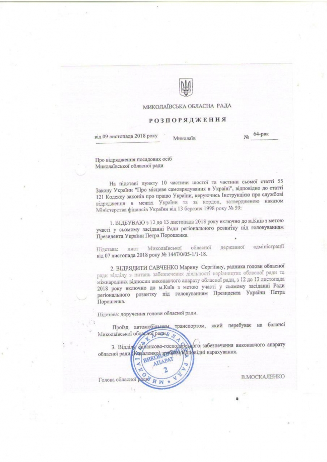 — Факты, распространенные некоторыми депутатами областного совета в средствах массовой информации, о моем отсутствии на рабочем месте не соответствуют действительности. Согласно приглашению 12 ноября я участвовала в заседании Совета регионального развития под председательством Президента Украины Петра Порошенко в Киеве, потом у меня был назначен ряд деловых встреч по поводу социально-экономического развития нашей области. Поэтому вернулась в город только в 6:00 утра 13 ноября. На работу приехала в 11:00. Хотя в соответствии с распоряжением срок пребывания в командировке 12-13 ноября 2018 года, - отметила Виктория Москаленко.