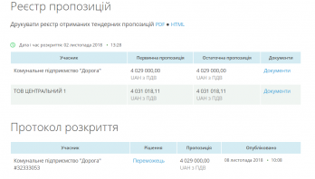 Победителем в обоих аукционах стало коммунальное предприятие «Дорога» с предложениями 3 миллиона 228 тысяч 300 гривен и 4 миллиона 29 тысяч. Также участие принимала компания ООО Центральный 1.