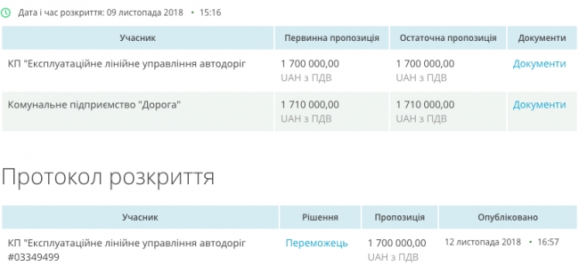Участие в торгах приняло 2 предприятия, среди которых: КП «Эксплуатационное линейное управление автодорог», которое выступило с предложением в 1 миллион 700 тысяч гривен и КП «Дорога» с предложением в 1 миллион 710 тысяч гривен.