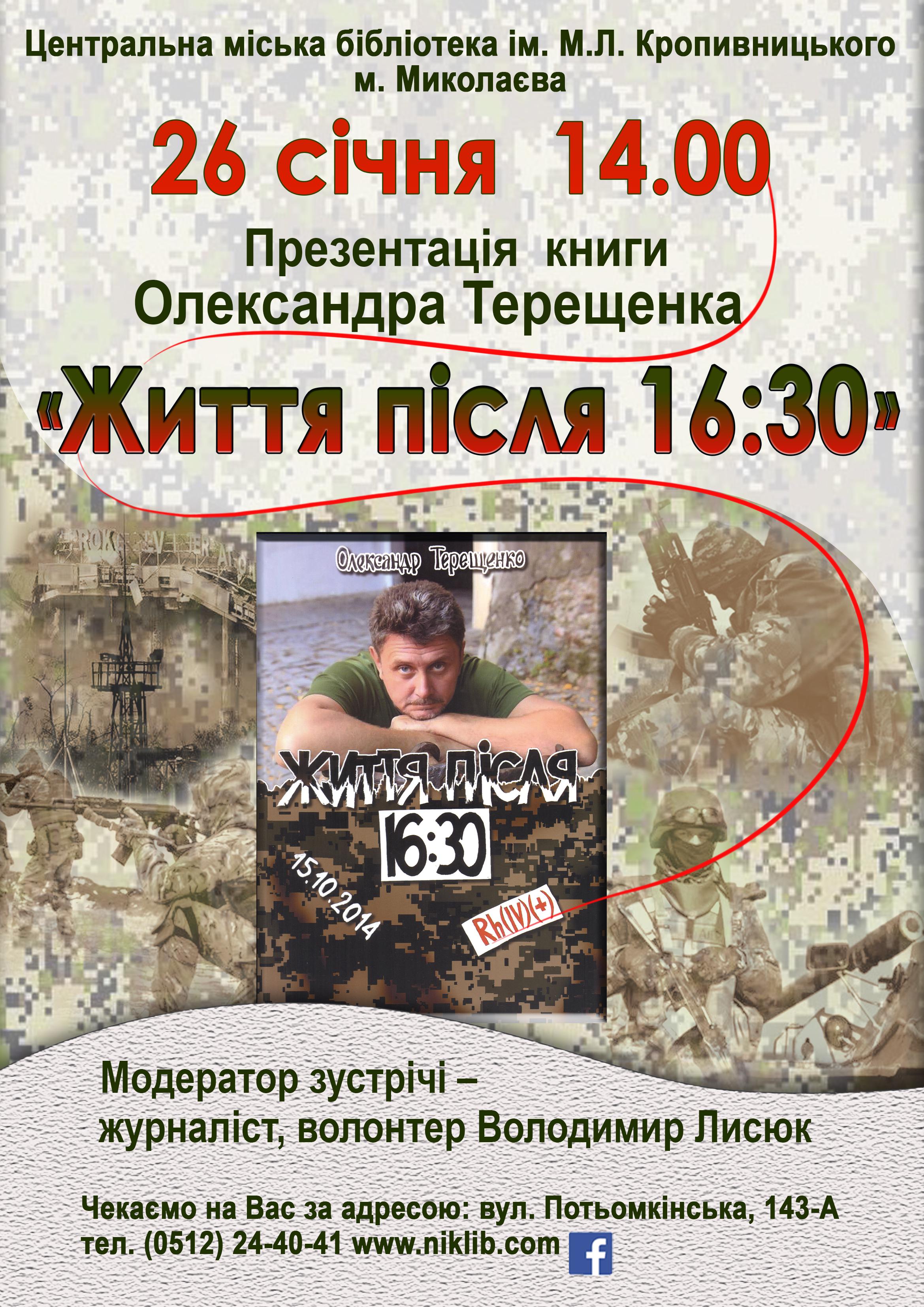 26 января в Николаеве состоится презентация книги «Жизнь после 16:30» участника боевых действий на Востоке Украины Александра Терещенко.
