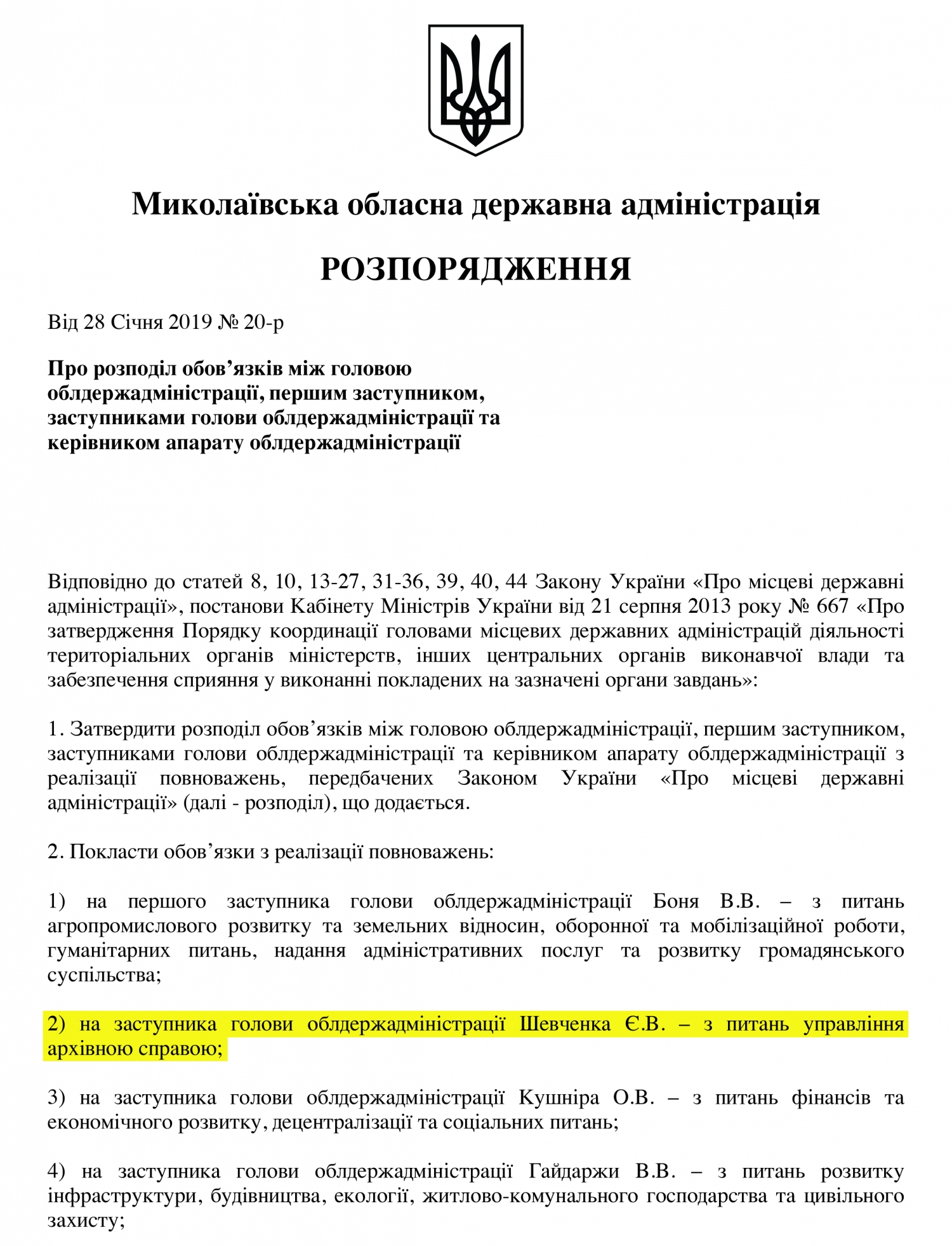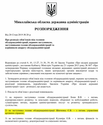 Как известно, у заместителя главы Николаевской облгосадминистрации Евгения Шевченко забрали все полномочия в гуманитарной сфере и поручили курировать работу государственного архива в Николаевской области.