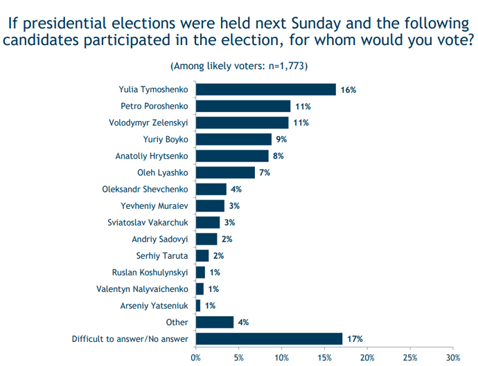 Среди тех, кто пойдет на выборы, 16% готовы поддержать Тимошенко, по 11% – Порошенко и Зеленского, 9% – Бойко и 8% – Гриценко.