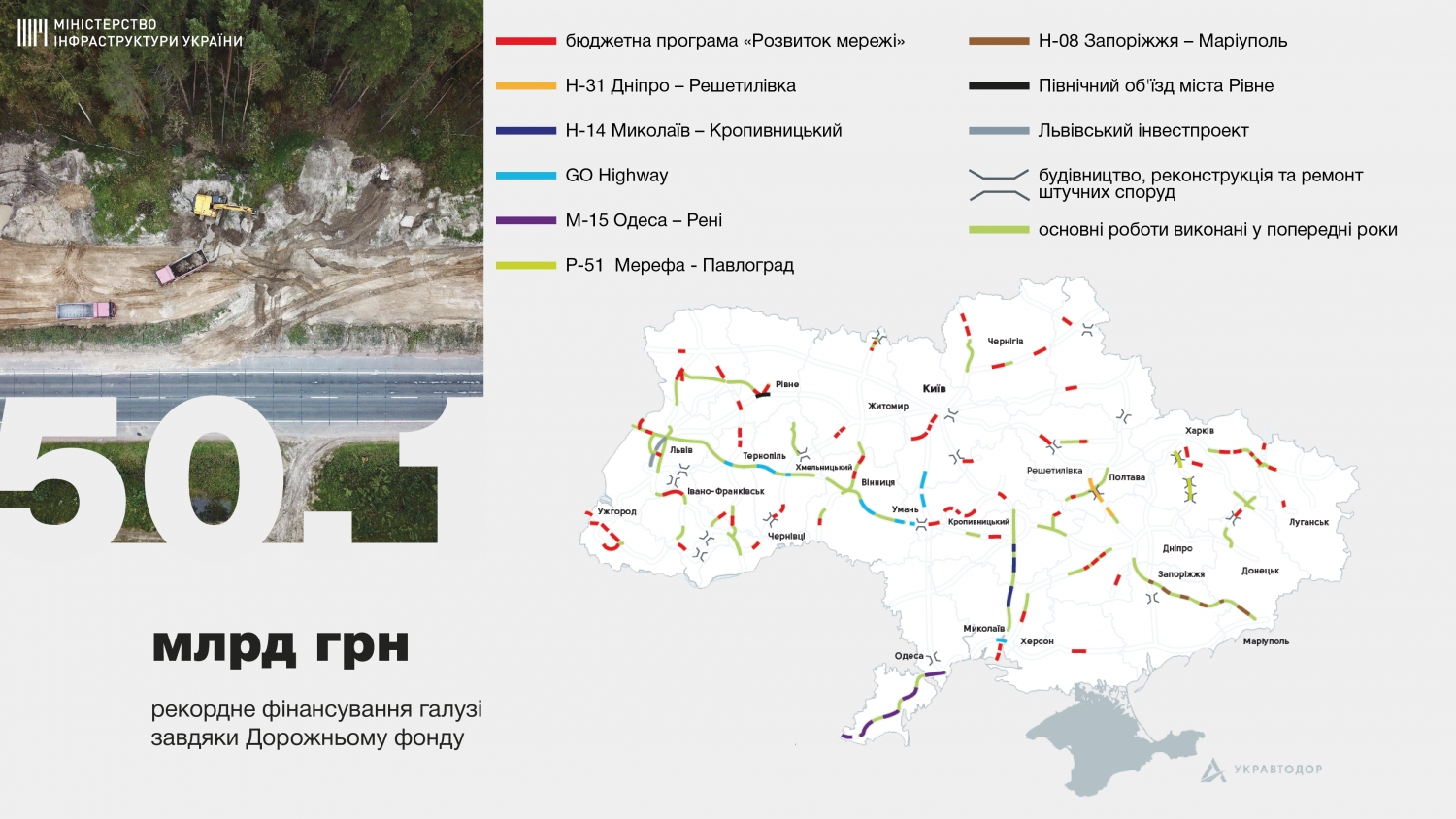 Также он отметил, что будут продолжены работы по развитию международного коридора GO Highway, а общая сумма Государственного дорожного фонда составит более 50 миллиардов гривен. В прошлом году из всех источников финансирования на дороги было направлено 42,5 миллиардов гривен.