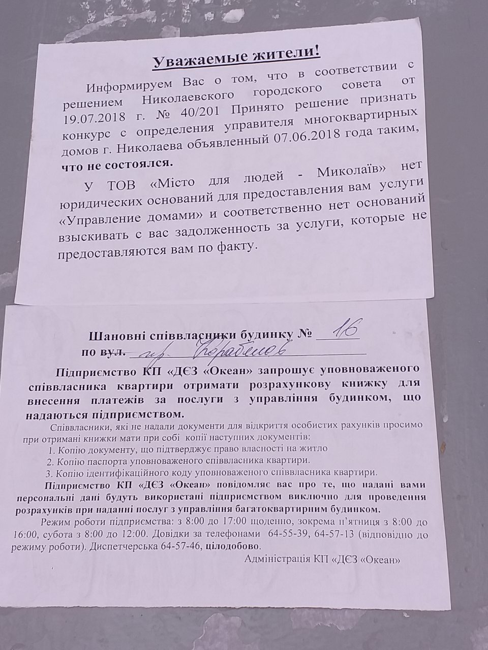 «Таким образом, анонимные объявления на домах содержат ложную информацию и направлены исключительно на дискредитацию деятельности нашей компании. Кроме этого, на домах также стали появляться объявления от имени администрации КП «ДЕЗ «Океан», в которых собственников квартир приглашают получать расчетную книжку для внесения платежей за услуги, якобы предоставляемые данным предприятием. Призываем жителей Корабельного района быть осторожными и не поддаваться на эти провокации! КП «ДЕЗ «Океан» не предоставляет никаких услуг жителям домов, которые находятся в управлении у компании «Місто для людей Миколаїв», - говорится в сообщении.