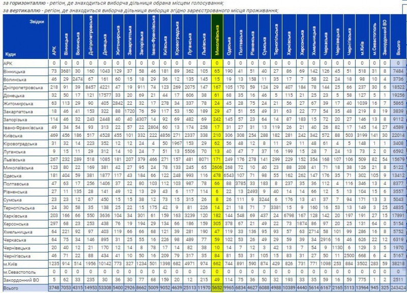 Больше всего николаевцы меняли место голосования в границах Николаевской области - это 2 тысячи 606 избирателей. Остальные выбирали местом голосования другие регионы Украины: 662 человека будут голосовать в Киеве, еще 210 человек указали местом голосования участки в Киевской области, 478 человек проголосует в соседней Одесской области и 305 - в Херсонской области.