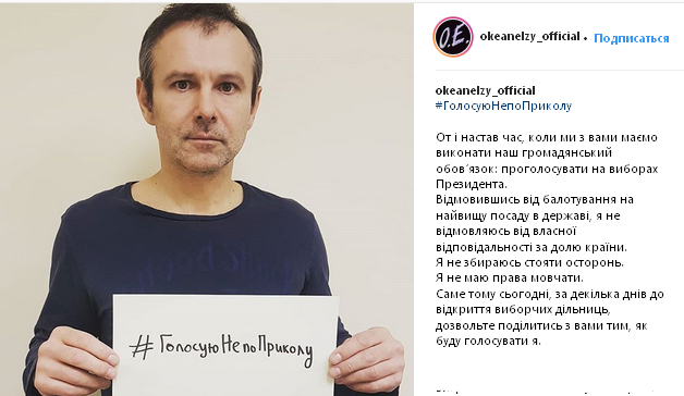 Популярный украинский певец Святослав Вакарчук обратился к украинцам с призывом проголосовать на выборах президента сознательно, а не по приколу.