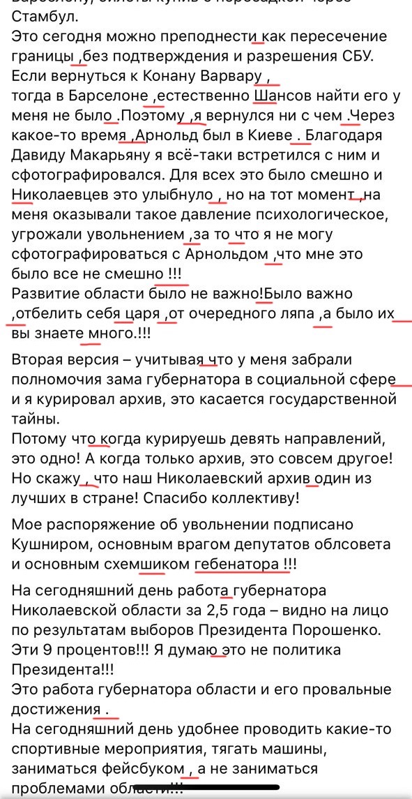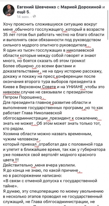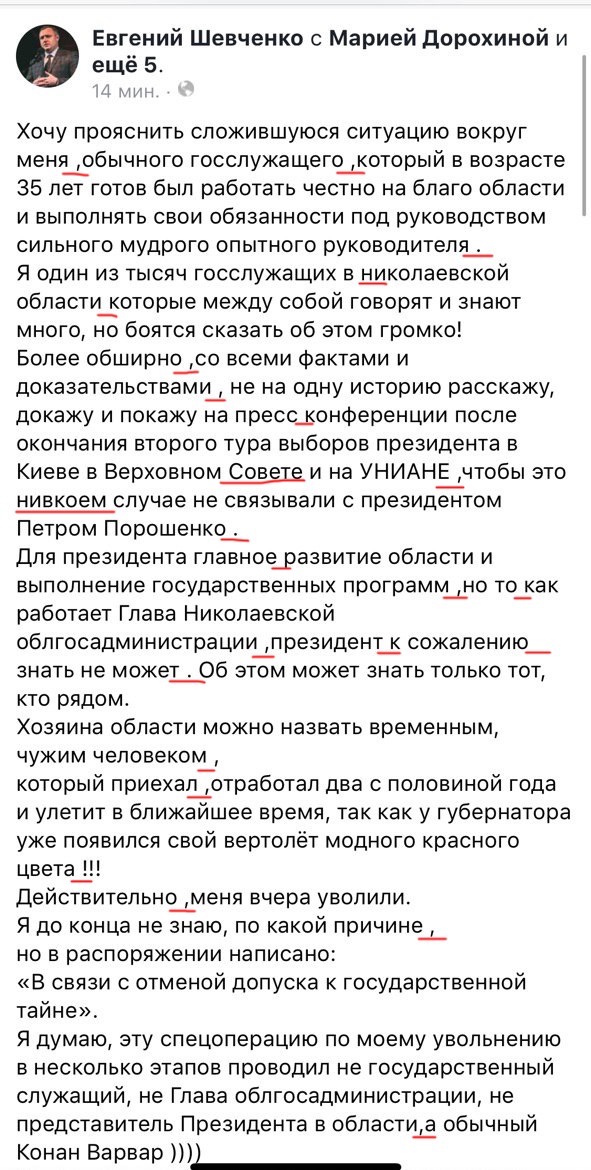 — Хочу прояснить сложившуюся ситуацию вокруг меня, обычного госслужащего, который в возрасте 35 лет готов был работать честно на благо области и выполнять свои обязанности под руководством сильного мудрого и опытного руководителя. Я один из тысяч госслужащих в Николаевской области, которые между собой говорят и знают много, но боятся сказать об этом громко! Более обширно, со всеми фактами и доказательствами , не на одну историю расскажу, докажу и покажу на пресс конференции после окончания второго тура выборов президента в Киеве в Верховном Совете и на УНИАНЕ ,чтобы это ни в коем случае не связывали с президентом Петром Порошенко. Для президента главное развитие области и выполнение государственных программ, но то как работает нлава Николаевской облгосадминистрации (Алексей Савченко, - прим.), президент, к сожалению, знать не может. Об этом может знать только тот, кто рядом. Хозяина области можно назвать временным, чужим человеком, который приехал, отработал два с половиной года и улетит в ближайшее время, так как у губернатора уже появился свой вертолёт модного красного цвета! Действительно, меня вчера уволили. Я до конца не знаю, по какой причине, но в распоряжении написано: «В связи с отменой допуска к государственной тайне». Я думаю, эту спецоперацию по моему увольнению в несколько этапов проводил не государственный служащий, не Глава облгосадминистрации, не представитель Президента в области, а обычный Конан Варвар, - написал Евгений Шевченко.