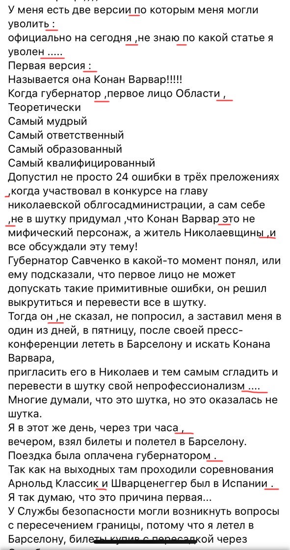— Официально на сегодня ,не знаю по какой статье я уволен… Первая версия: называется она Конан Варвар! Когда губернатор, первое лицо области, теоретически самый мудрый, самый ответственный, самый образованный, самый квалифицированный, допустил не просто 24 ошибки в трёх преложениях, когда участвовал в конкурсе на главу николаевской облгосадминистрации, а сам себе, не в шутку придумал, что Конан Варвар — это не мифический персонаж, а житель Николаевщины, и все обсуждали эту тему! Губернатор Савченко в какой-то момент понял, или ему подсказали, что первое лицо не может допускать такие примитивные ошибки, он решил выкрутиться и перевести все в шутку. Тогда он, не сказал, не попросил, а заставил меня в один из дней, в пятницу, после своей пресс-конференции лететь в Барселону и искать Конана Варвара, пригласить его в Николаев и тем самым сгладить и перевести в шутку свой непрофессионализм… Многие думали, что это шутка, но это оказалась не шутка, - написал Евгений Шевченко.