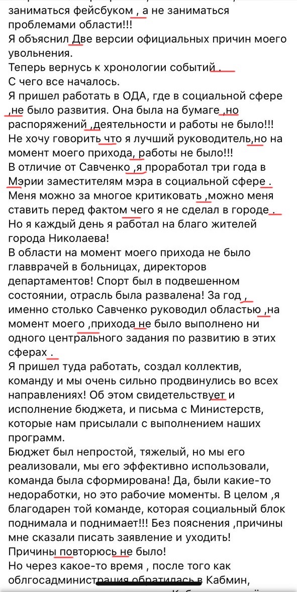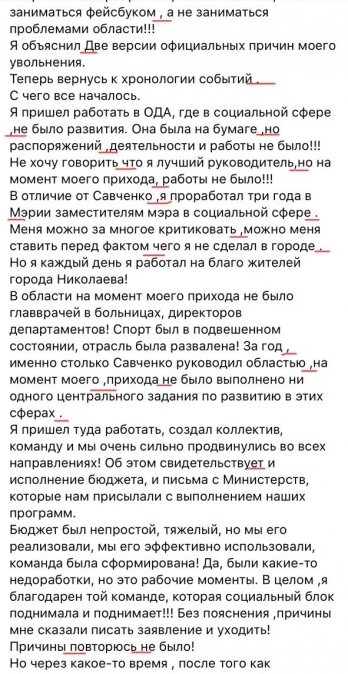 — Я пришел работать в ОДА, где в социальной сфере не было развития. Она была на бумаге, но распоряжений, деятельности и работы не было! Не хочу говорить что я лучший руководитель, но на момент моего прихода, работы не было! В отличие от Савченко, я проработал три года в мэрии заместителем мэра в социальной сфере. Меня можно за многое критиковать, можно меня ставить перед фактом, чего я не сделал в городе. Но я каждый день работал на благо жителей города Николаева! В области на момент моего прихода не было главврачей в больницах, директоров департаментов! Спорт был в подвешенном состоянии, отрасль была развалена! За год, именно столько Савченко руководил областью на момент моего прихода, не было выполнено ни одного центрального задания по развитию в этих сферах. Я пришел туда работать, создал коллектив, команду и мы очень сильно продвинулись во всех направлениях! Об этом свидетельствует и исполнение бюджета и письма с Министерств, которые нам присылали с выполнением наших программ. Бюджет был непростой, тяжелый, но мы его реализовали, мы его эффективно использовали, команда была сформирована! Да, были какие-то недоработки, но это рабочие моменты. В целом, я благодарен той команде, которая социальный блок поднимала и поднимает! Без пояснения причины мне сказали писать заявление и уходить! Причины повторюсь не было! Но через какое-то время, после того как облгосадминистрация обратилась в Кабмин проверить мою деятельность, Кабмин не нашёл в моих действиях нарушений!, - написал Евгений Шевченко.