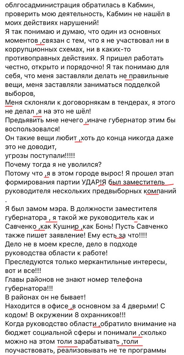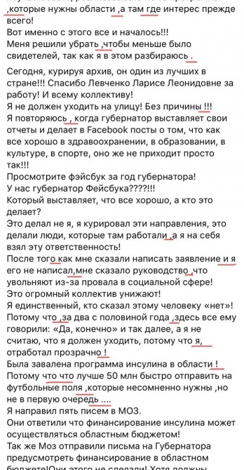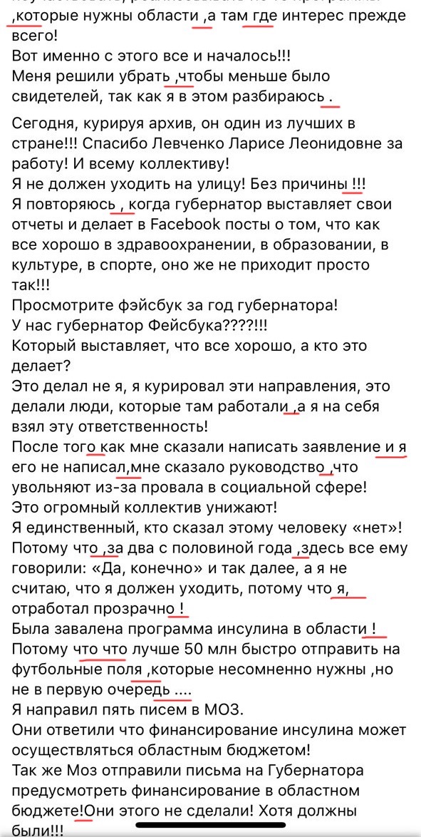 — Когда руководство области обратило внимание на бюджет социальной сферы и понимали, сколько можно на этом толи зарабатывать, толи поучаствовать, реализовывать не те программы, которые нужны области, а там где интерес прежде всего! Вот именно с этого все и началось! Меня решили убрать, чтобы меньше было свидетелей, так как я в этом разбираюсь. Сегодня, курируя архив, он один из лучших в стране!!! Спасибо Левченко Ларисе Леонидовне за работу! И всему коллективу! Я не должен уходить на улицу! Без причины! Я повторяюсь, когда губернатор выставляет свои отчеты и делает в Facebook посты о том, что как все хорошо в здравоохранении, в образовании, в культуре, в спорте, оно же не приходит просто так! Просмотрите фэйсбук за год губернатора! У нас губернатор Фейсбука? Который выставляет, что все хорошо, а кто это делает? Это делал не я, я курировал эти направления, это делали люди, которые там работали, а я на себя взял эту ответственность! После того, как мне сказали написать заявление, и я его не написал, мне сказало руководство, что увольняют из-за провала в социальной сфере! Это огромный коллектив унижают! Я единственный, кто сказал этому человеку «нет»! Потому что, за два с половиной года, здесь все ему говорили: «Да, конечно» и так далее, а я не считаю, что я должен уходить, потому что я, отработал прозрачно! - написал Евгений Шевченко.