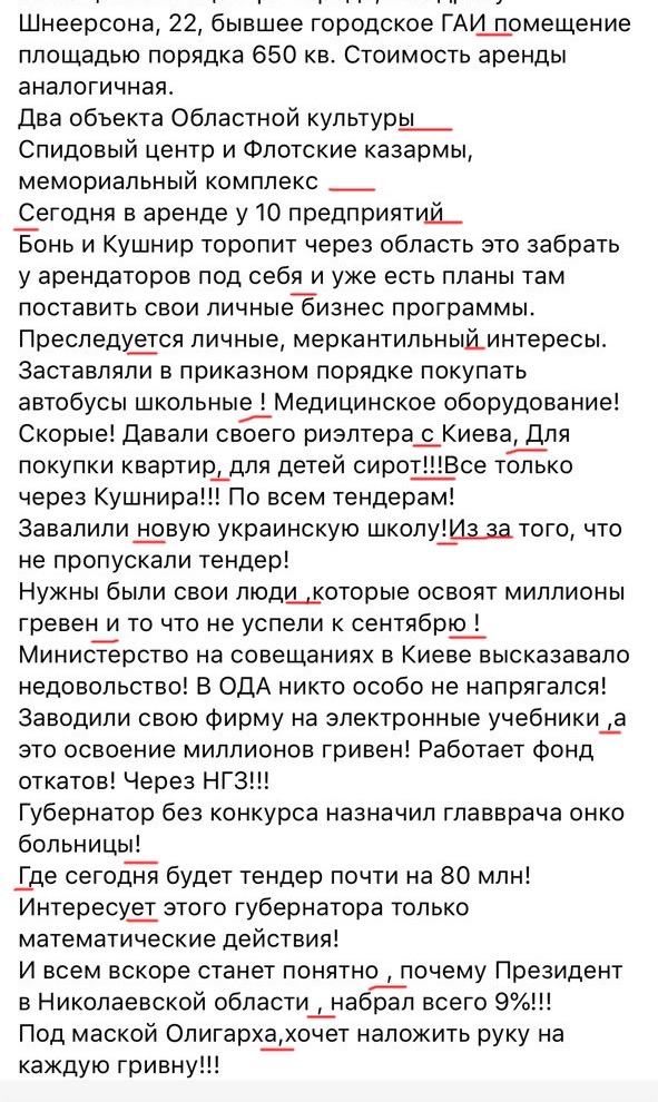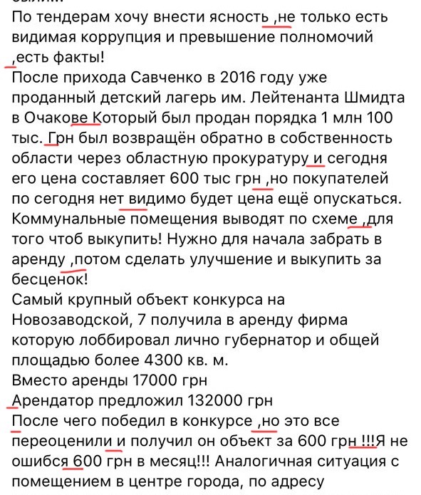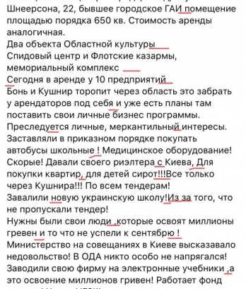 — По тендерам хочу внести ясность, не только есть видимая коррупция и превышение полномочий ,есть факты! После прихода Савченко в 2016 году уже проданный детский лагерь им. Лейтенанта Шмидта в Очакове Который был продан порядка 1 миллиона 100 тысяч гривен, был возвращён обратно в собственность области через областную прокуратуру, и сегодня его цена составляет 600 тысяч гривен, но покупателей по сегодня нет - видимо будет цена ещё опускаться. Коммунальные помещения выводят по схеме, для того чтоб выкупить! Нужно для начала забрать в аренду ,потом сделать улучшение и выкупить за бесценок! Самый крупный объект конкурса на Новозаводской, 7 получила в аренду фирма которую лоббировал лично губернатор и общей площадью более 4300 кв. м. Вместо аренды 17000 гривен арендатор предложил 132000 гривен, после чего победил в конкурсе, но это все переоценили и получил он объект за 600 гривен! Я не ошибся 600 гривен в месяц! Аналогичная ситуация с помещением в центре города, по адресу Шнеерсона, 22, бывшее городское ГАИ, помещение площадью порядка 650 кв. м. Стоимость аренды аналогичная. Два объекта Областной культуры, Спидовый центр и Флотские казармы, мемориальный комплекс. Сегодня в аренде у 10 предприятий. Бонь и Кушнир торопит через область это забрать у арендаторов под себя, и уже есть планы там поставить свои личные бизнес программы. Преследуется личные, меркантильный интересы. Заставляли в приказном порядке покупать автобусы школьные! Медицинское оборудование! Скорые! Давали своего риэлтера из Киева для покупки квартир для детей-сирот! Все только через Кушнира! По всем тендерам! Завалили новую украинскую школу!Из-за того, что не пропускали тендер! Нужны были свои люди, которые освоят миллионы гривен, и то что не успели к сентябрю! Министерство на совещаниях в Киеве высказывало недовольство! В ОГА никто особо не напрягался! Заводили свою фирму на электронные учебники, а это освоение миллионов гривен! Работает фонд откатов! Через НГЗ!!!Губернатор без конкурса назначил главврача онкологической больницы, где сегодня будет тендер почти на 80 миллионов! Интересуют этого губернатора только математические действия! И всем вскоре станет понятно, почему Президент в Николаевской области набрал всего 9%! Под маской олигарха хочет наложить руку на каждую гривну!, - написал Евгений Шевченко.