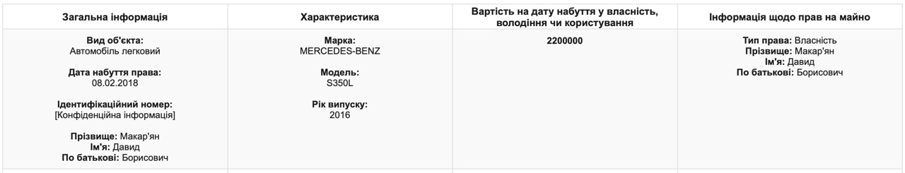 Согласно данным декларации за прошлый год, Давид Макарьян сменил автомобиль Range Rover 2012 года выпуска, на котором ездил в 2017 году, на новый - Mercedes-Benz S350L 2016 года выпуска стоимостью 2,2 миллиона гривен.