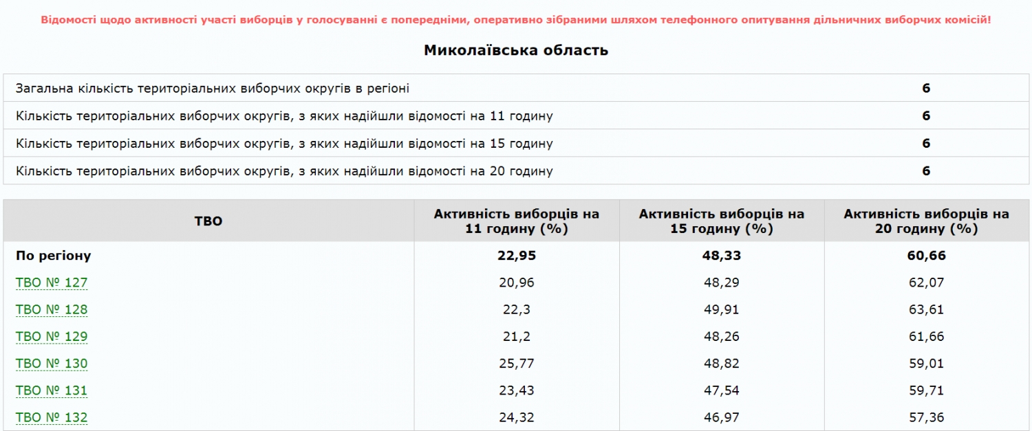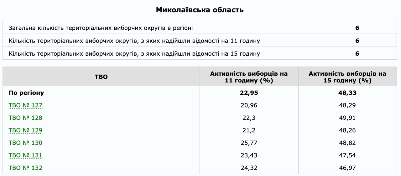 16:37 ЦИК обнародовала явку избирателей на Николаевщине состоянием на 15:00. Проголосовало уже 48,33% избирателей.