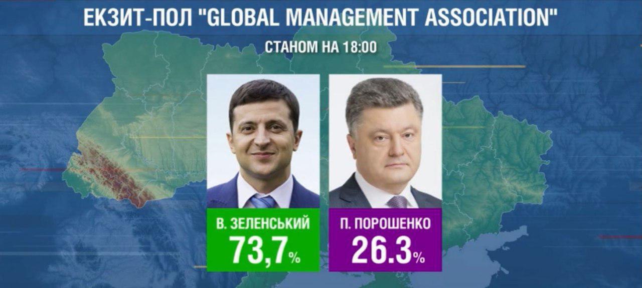 По данным Национального экзитпола, на 18:00 шоумен Владимир Зеленский лидирует в первом туре голосования на выборах президента Украины с 73,2%, действующий глава государства Петр Порошенко набирает 25,3%.