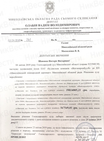 Депутат Николаевского областного совета Вадим Олабин потребовал от главы облсовета Виктории Москаленко действий по обжалованию решения Хозяйственного суда о взыскании с коммунального предприятия «Николаевский международный аэропорт» больше 40 миллионов гривен за ремонт здания аэровокзала.