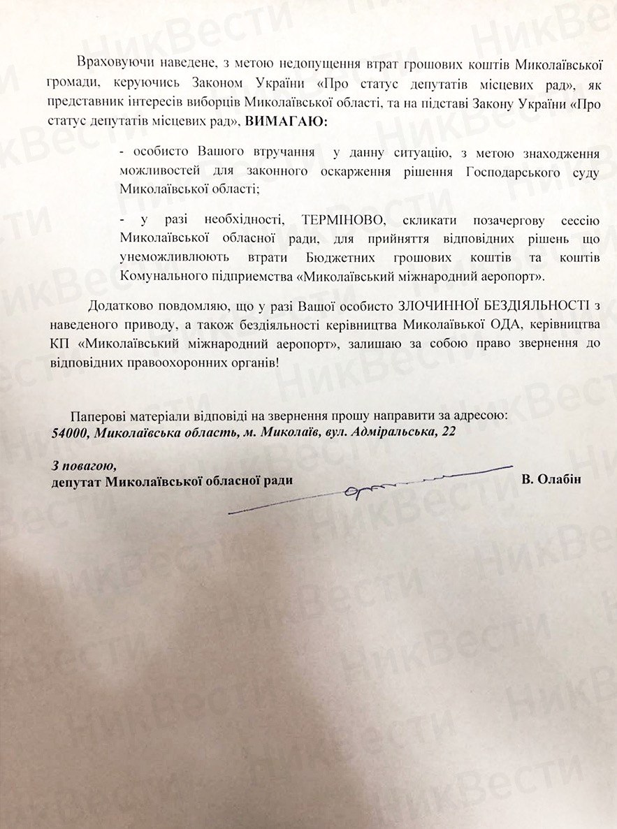 Депутат отметил, что в случае бездеятельности главы Николаевского облсовета по этому вопросу, а также бездеятельности руководства Николаевской ОГА и КП «Николаевский международный аэропорт», он оставляет за собой право обратиться в соответствующие правоохранительные органы.