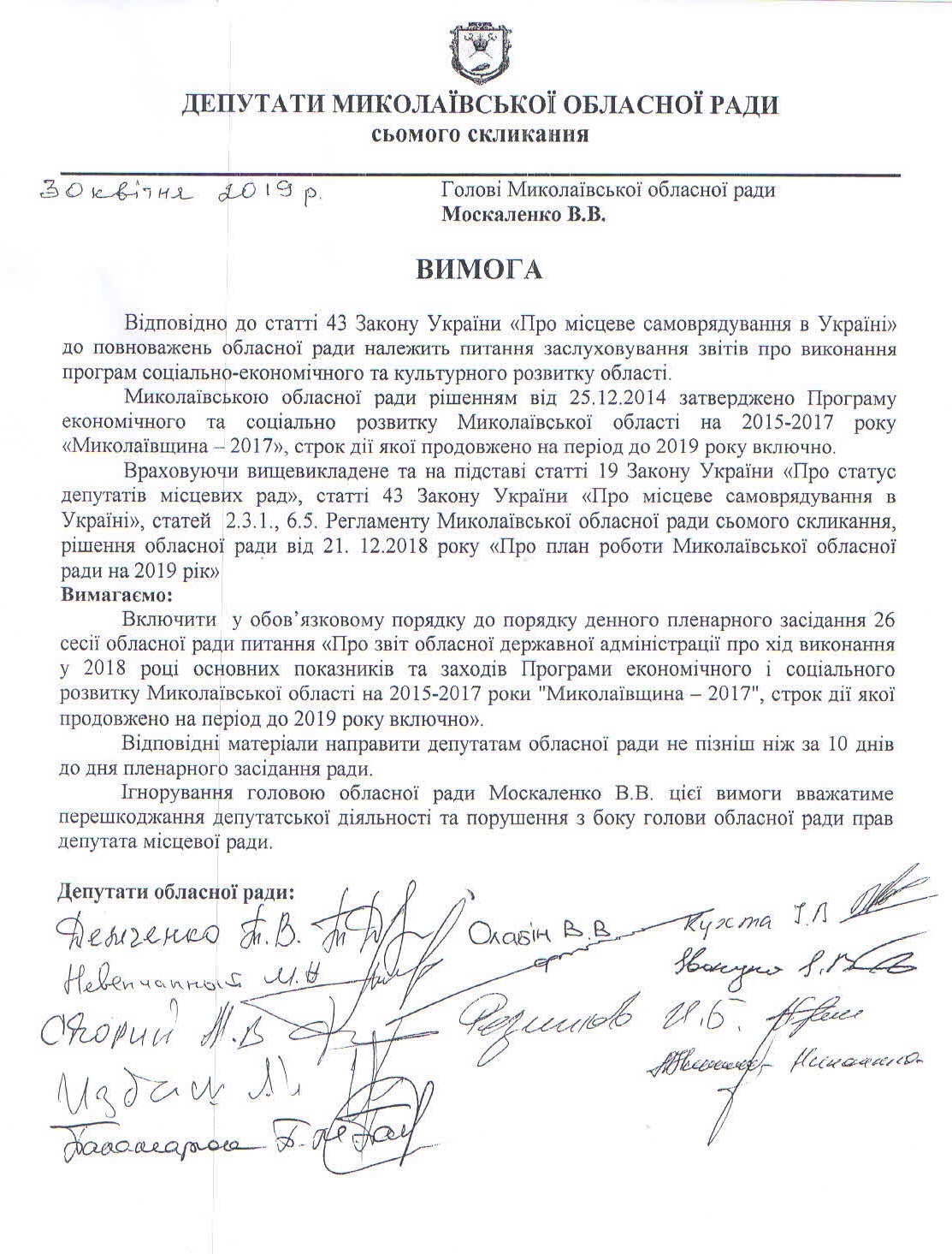 — Включить в обязательном порядке в повестку дня пленарного заседания 26 сессии областного совета вопрос «Об отчете областной государственной администрации о ходе выполнения в 2018 году основных показателей и мероприятий Программы экономического и социального развития Николаевской области на 2015-2017 годы»Николаевщина – 2017», срок действия которой продлен на период до 2019 года включительно., - сказано в заявлении.