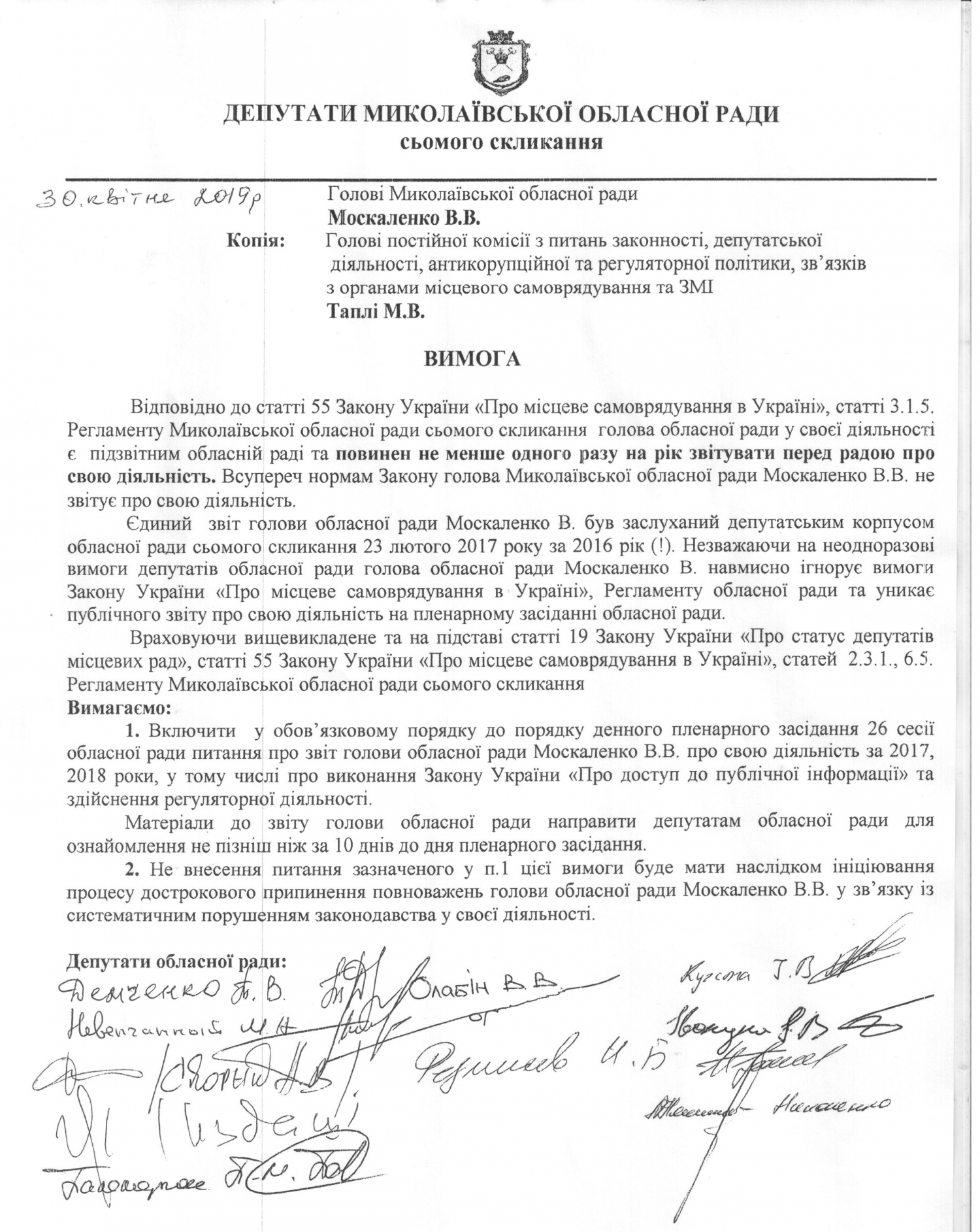 Также депутаты требуют заслушать отчет о деятельности председателя Николаевского областного совета Виктории Москаленко в соответствии со статьей 55 Закона Украины «О местном самоуправлении в Украине»