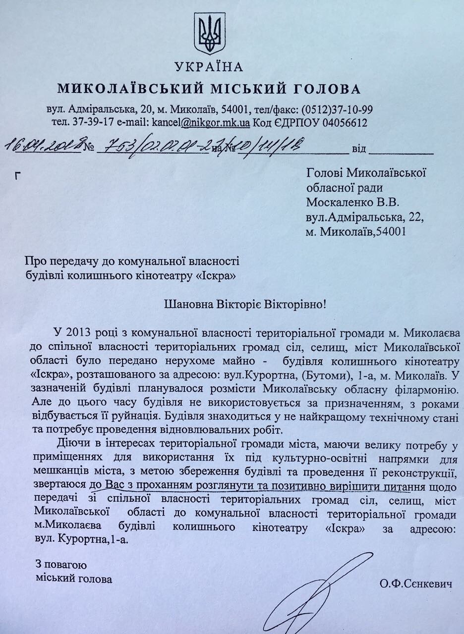 Согласно документу, Александр Сенкевич обратился к чиновнице с просьбой рассмотреть возможность и передать в коммунальную собственность города кинотеатр «Искра» для создания там культурного учреждения. Однако данное обращение было проигнорировано Викторией Москаленко.