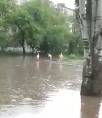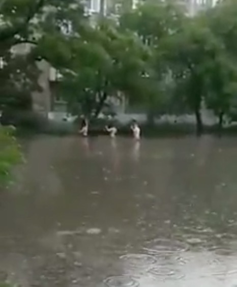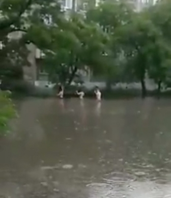 На видео видно, как трое мужчин, раздевшись, пересекали улицу Гражданскую на пересечении с проспектом Центральным. Воды им, при этом, было по пояс.