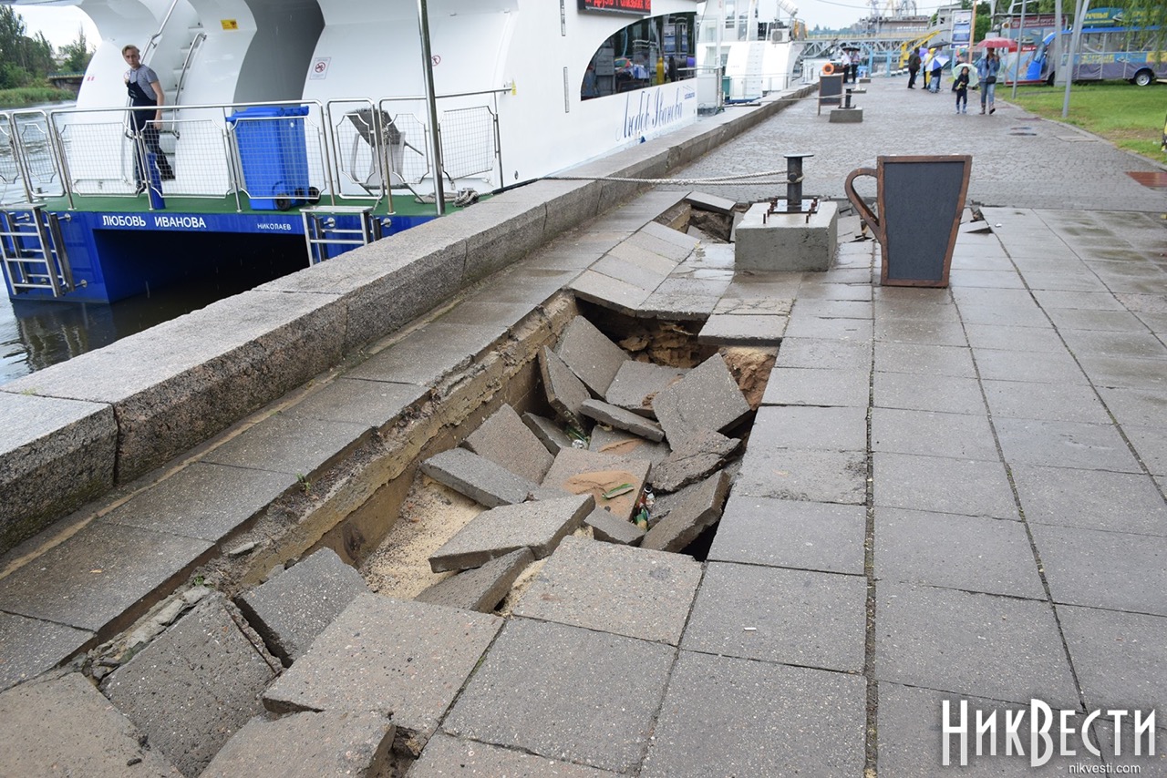 На нижней Набережной в Николаеве из-за сильного ливня провалилась тротуарная плитка.