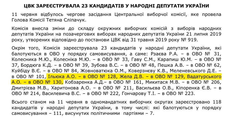 Всего состоянием на 11 июня в мажоритарных округах по Украине зарегистрировано 118 кандидатов в народные депутаты, 111 из которых - самовыдвиженцы.