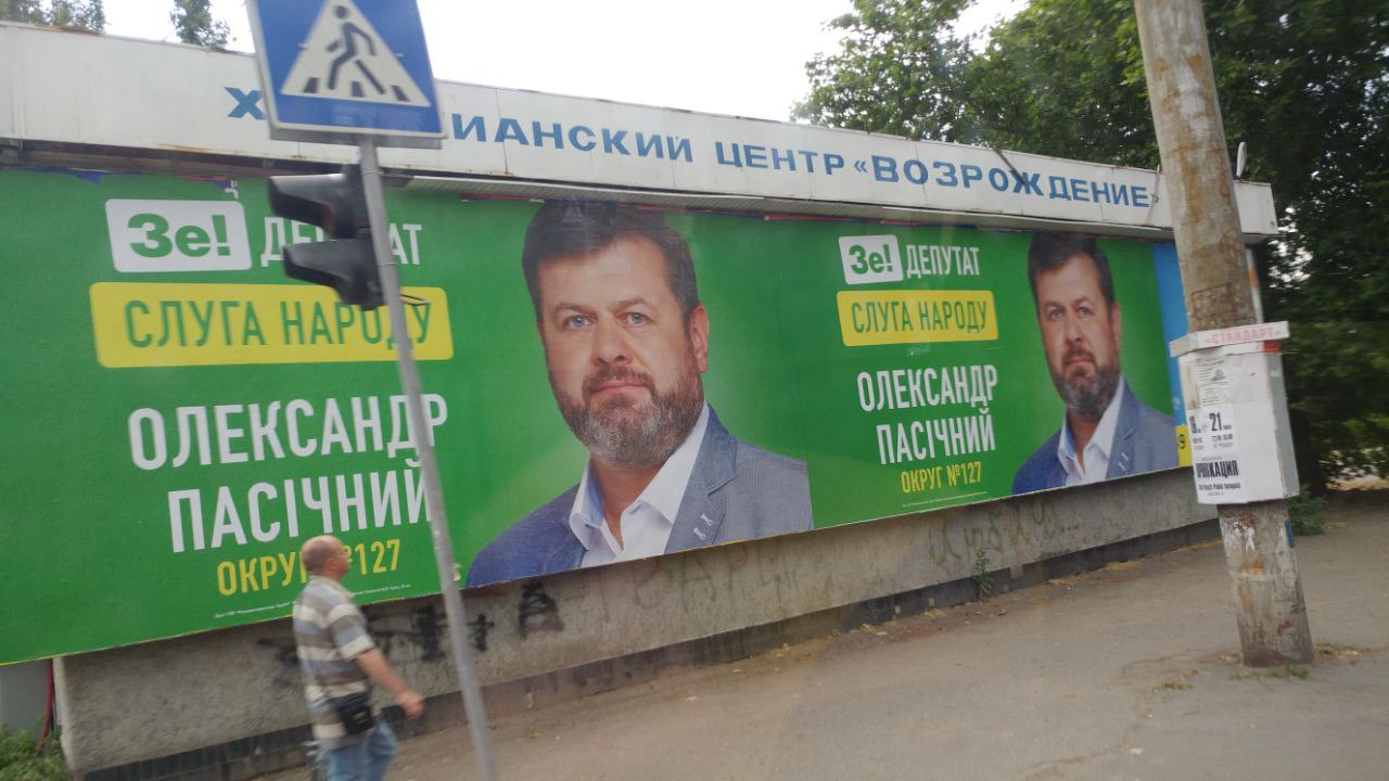 Кандидат в народные депутаты Александр Пасечный, который баллотируется по 127 округу, в свою очередь, разместил свою рекламу на плоскости по улице Курортной в районе здания кинотеатра «Искра» в микрорайоне Лески Заводского района Николаева.
