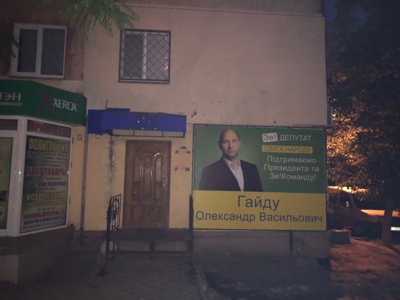 Кандидат в нардепы от «Слуги народа» по 128 избирательному округу Александр Гайду разместил свою агитацию на фасаде здания по проспекту Мира, 5 в Ингульском районе.