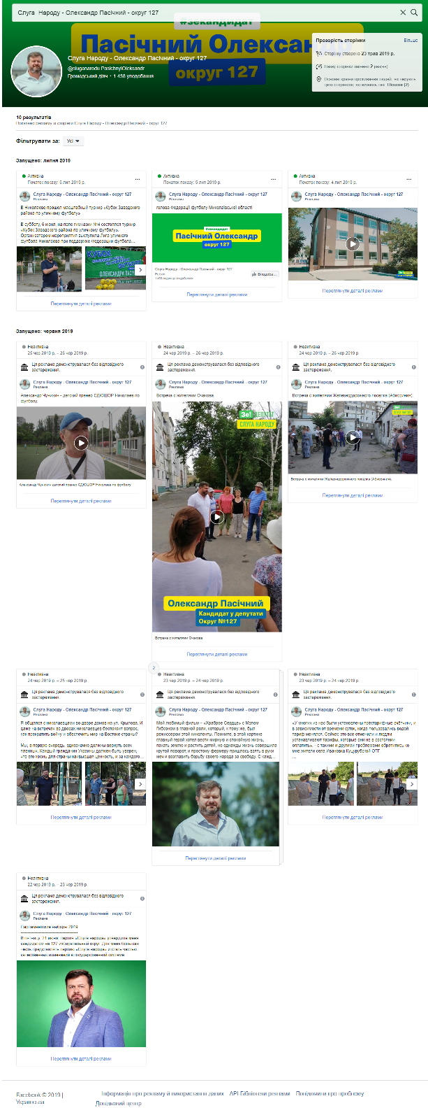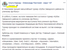 В свою очередь Лига уличного футбола размещает на своей странице агитационные ролики кандидата Александра Пасечного с надписью партии «Зе! Депутат Слуга народа».