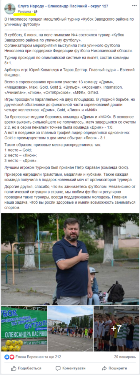 Гражданская сеть «Опора» уличила кандидата в народные депутаты от партии «Слуга народа» по 127 округу Александра Пасечного в использовании своего служебного положения для ведения агитации во время Кубка уличного футбола, который проходил при поддержке Федерации футбола в Николаевской области, которую тот возглавляет.