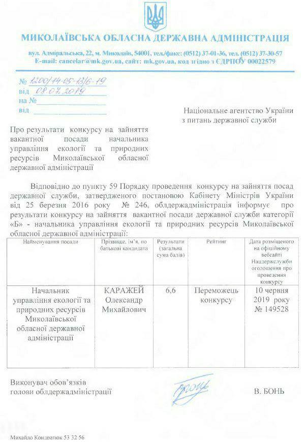 — Думаю, многие в Николаеве помнят перипетии конкурса по выборам руководителя РЛП «Тилигульский». Документы подали два кандидата: эколог Олег Деркач, победивший в конкурсе в 2016 году, и фактически возглавлявший парк два года, и депутат облсовета Александр Каражей, руководивший РЛП полтора года до Деркача (последнее время занимавший должность замглавы Коблевской ОТГ). Результаты конкурса до сих пор не известны. Но стало известно, что Каражей победил в конкурсе на должность начальника управления экологии и природных ресурсов Николаевской ОГА. Документ за подписью в.о. председателя Николаевской ОГА В.Боня прилагается, - написал Федор Левченко.