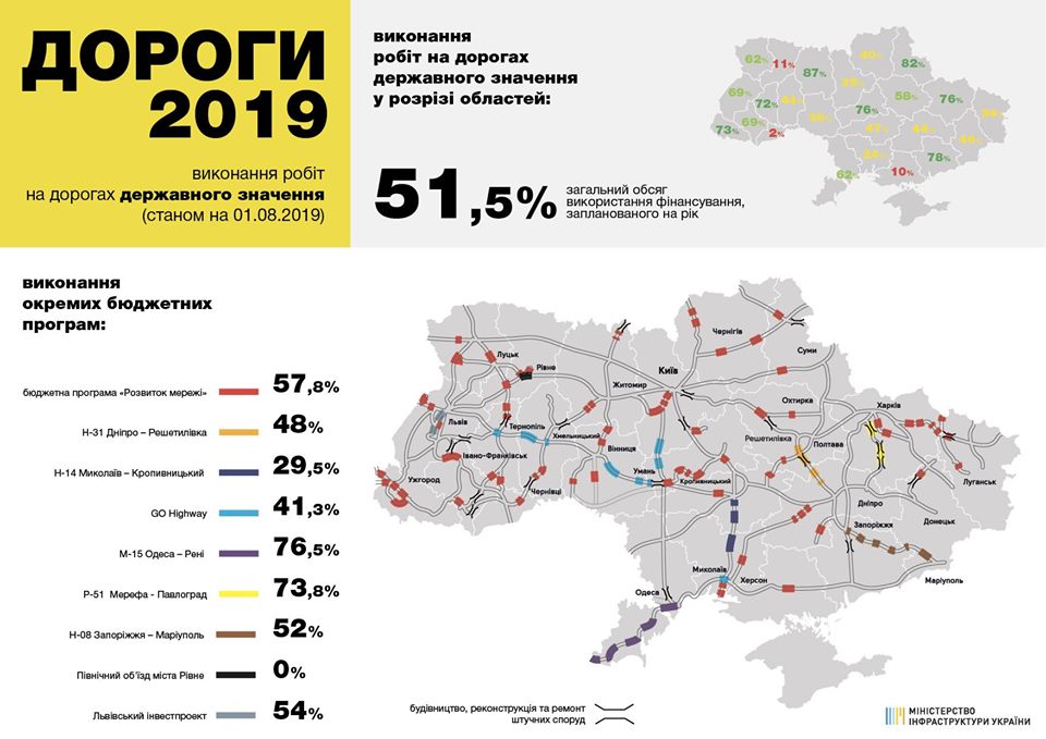 Владимир Омелян сообщил, что состояние выполнения дорожных работ на автодорогах государственного значения по состоянию на 1 августа 2019 составляет 51,5%, что является нормальным показателем среди строительного сезона.