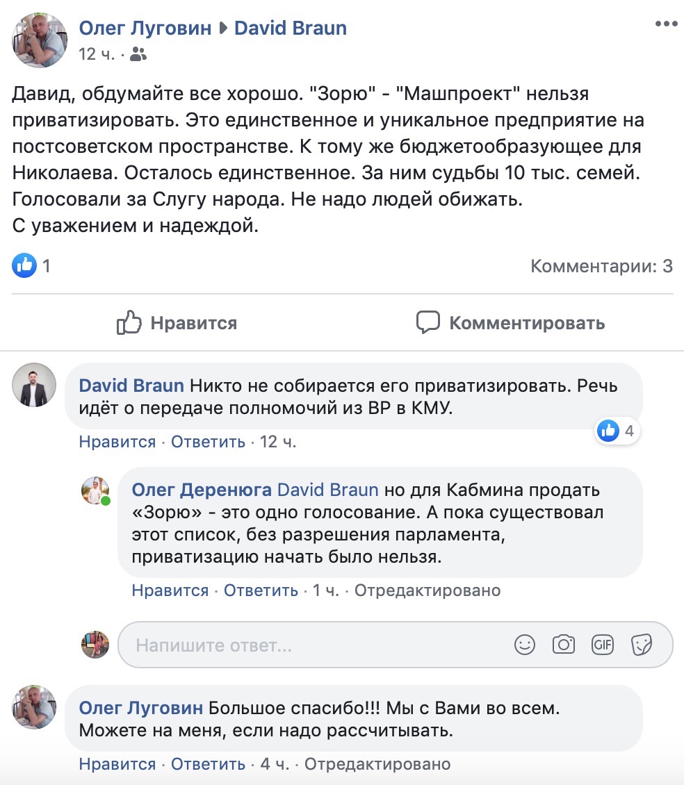 — Давид, обдумайте все хорошо. «Зорю» - «Машпроект» нельзя приватизировать. Это единственное и уникальное предприятие на постсоветском пространстве. К тому же бюджетообразующее для Николаева. Осталось единственное. За ним судьбы 10 тыс. семей. Голосовали за Слугу народа. Не надо людей обижать, - написал Олег Луговин.