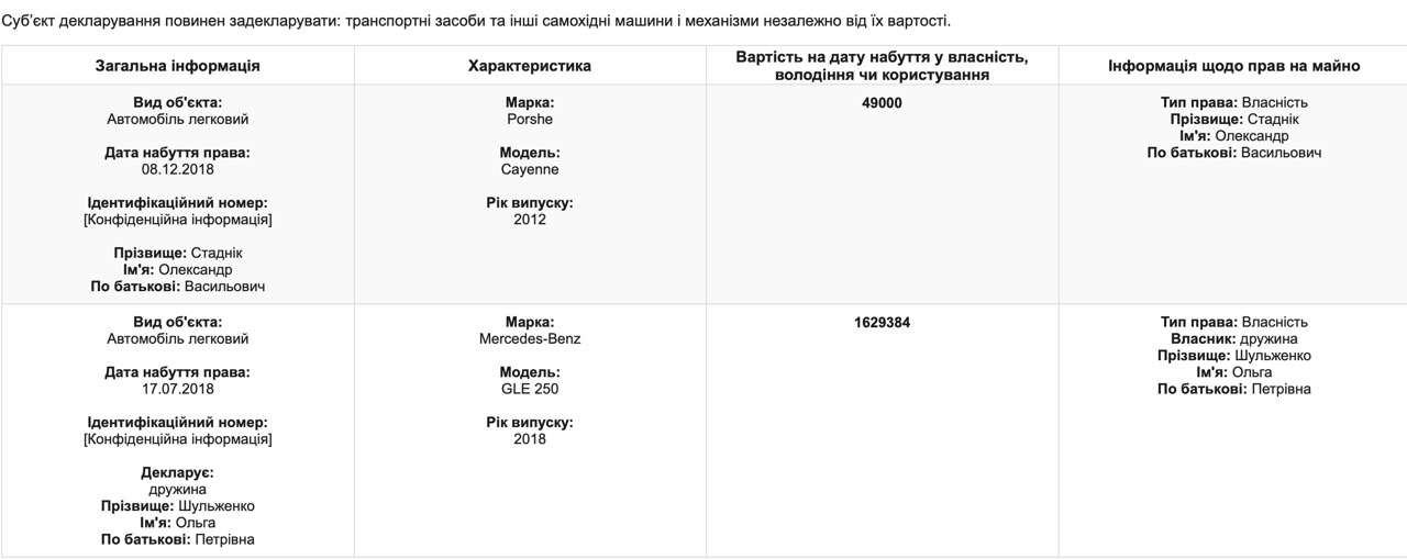 Сам Александр Стадник передвигается на Porshe Cayenne 2012 года выпуска, его жена — на Mercedes-Benz GLE 250 2018 года выпуска за 1,6 миллиона гривен.