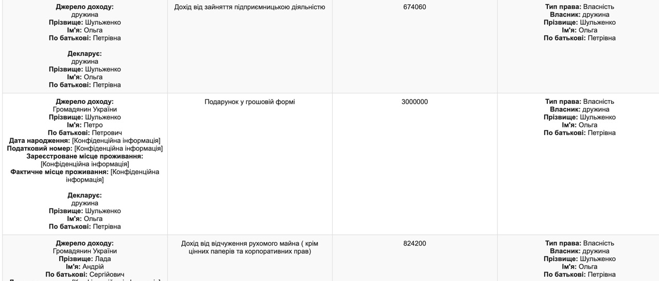 Еще 3 миллиона гривен семье подарил отец жены - Петр Шульженко. Еще 824 тысячи гривен Ольга Шульженко задекларировала как доход от продажи движимого имущества некому Андрею Лада.