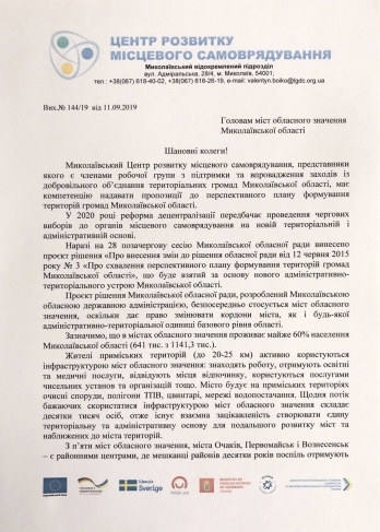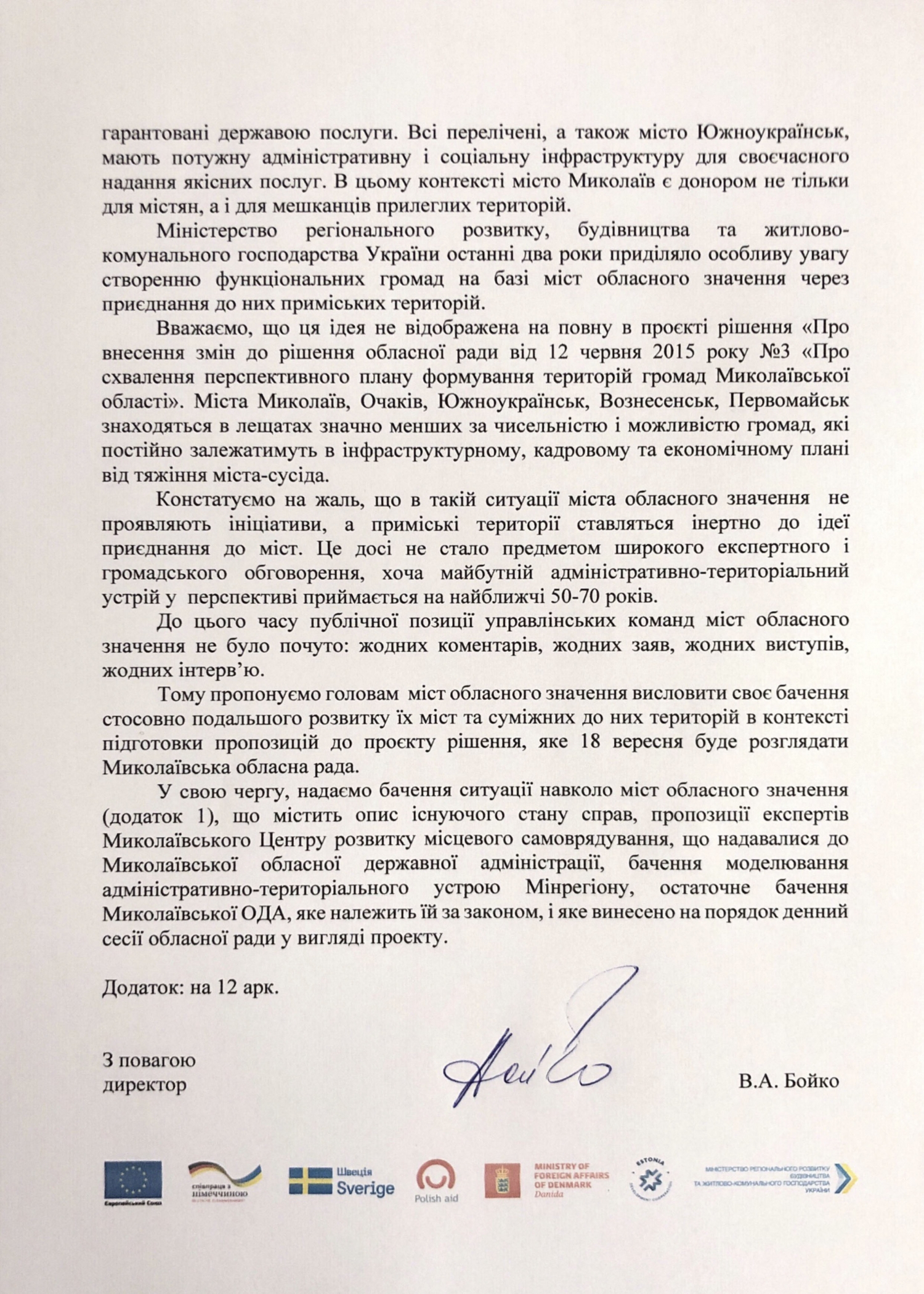 «Считаем, что эта идея не отображена на полную в проекте решения. Города Николаев, Очаков, Южноукраинск, Вознесенск, Первомайск находятся в тисках значительно меньших по численности и возможности общин, которые будут постоянно зависеть в инфраструктурном, кадровом и экономическом плане от притяжения города-соседа», - говорится в письме за подписью Валентина Бойко.