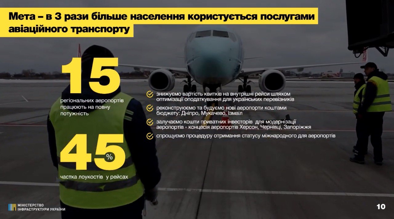 По словам Владислава Криклия, министерство собирается в течение ближайших пяти лет повысить аэромобильность в Украине с 5 до 15%. В частности планируется за бюджетные деньги провести масштабную реконструкцию аэропорта в Днепре, а также открыть аэропорты в Мукачево и Измаиле.